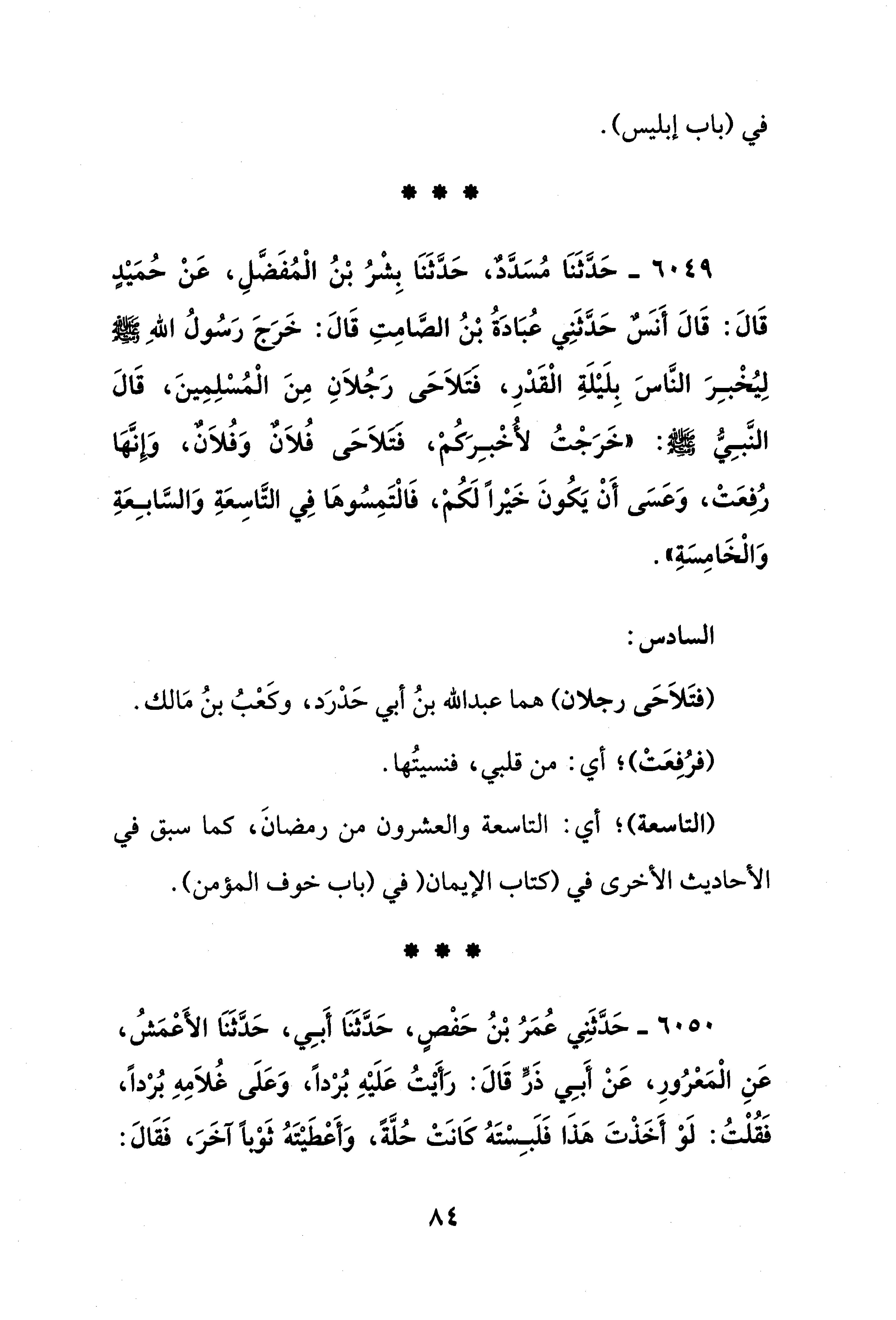 6049 - حَدَّثَنَا مُسَدَّدٌ، حَدَّثَنَا بِشْرُ بْنُ الْمُفَضَّلِ، عَنْ حُمَيْدٍ قَالَ: قَالَ أَنَسٌ حَدَّثَنِي عُبَادَةُ بْنُ الصَّامِتِ قَالَ: خَرَجَ رَسُولُ اللهِ - صلى الله عليه وسلم - لِيُخْبِرَ النَّاسَ بِلَيْلَةِ الْقَدْرِ، فتلاَحَى رَجُلاَنِ مِنَ الْمُسْلِمِينَ، قَالَ النَّبِيُّ - صلى الله عليه وسلم -: "خَرَجْتُ لأُخْبِرَكُم، فَتَلاَحَى فُلاَنٌ وَفُلاَنٌ، وَإنَّهَا رُفِعَتْ، وَعَسَى أَنْ يَكُونَ خَيْرًا لَكُمْ، فَالْتَمِسُوهَا فِي التَّاسِعَةِ وَالسَّابِعَةِ وَالْخَامِسَةِ".
