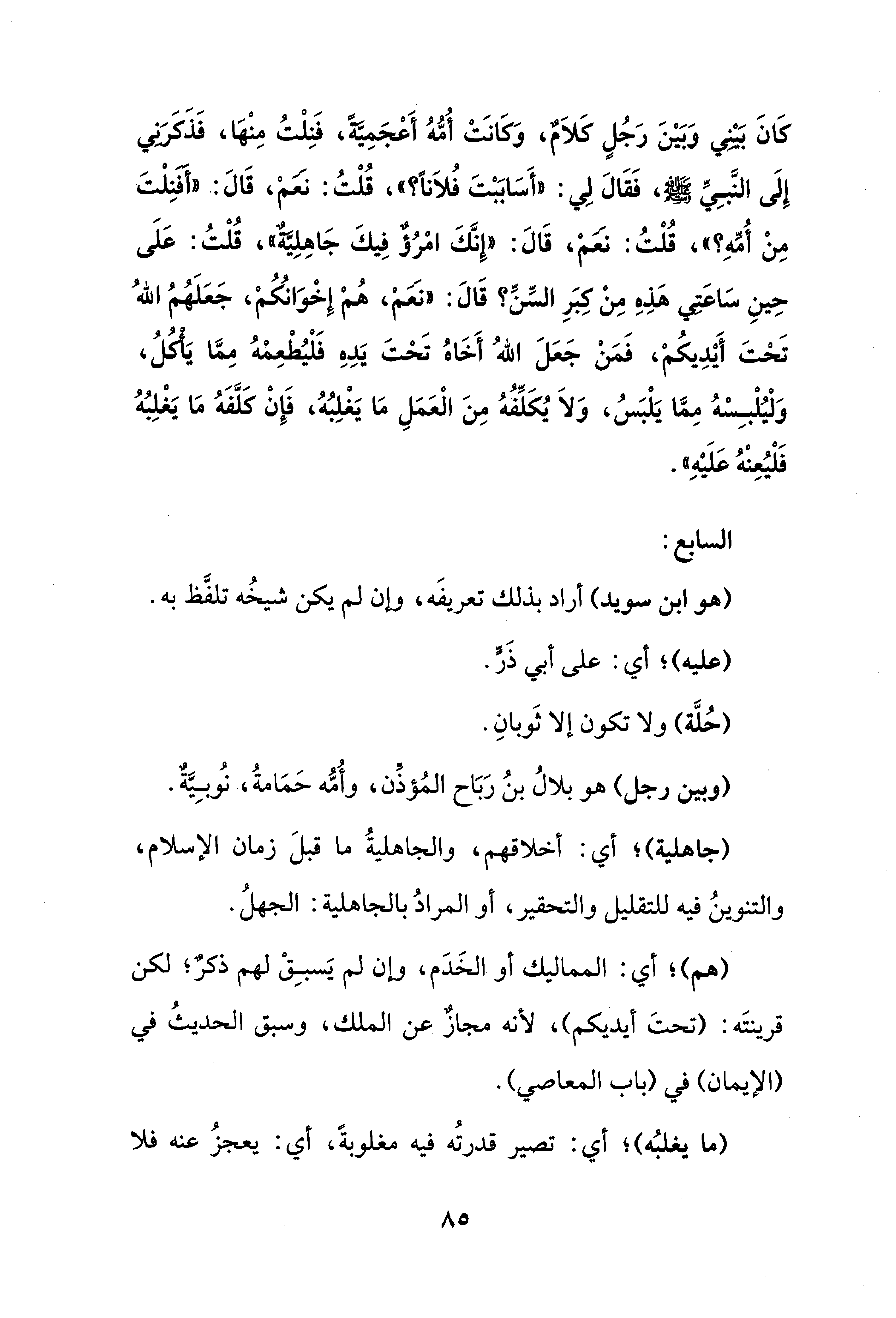 كَانَ بَيْنِي وَبَيْنَ رَجُلٍ كَلاَمٌ، وَكَانَتْ أُمُّهُ أَعْجَمِيَّةً، فَنِلْتُ مِنْهَا، فَذَكَرَنِي إِلَى النَّبِيِّ - صلى الله عليه وسلم -، فَقَالَ لِي: "أَسَابَبْتَ فُلاَنًا؟ "، قُلْتُ: نَعَمْ، قَالَ: "أَفَنِلْتَ مِنْ أُمِّهِ؟ "، قُلْتُ: نَعَمْ، قَالَ: "إِنَّكَ امْرُؤٌ فِيكَ جَاهِلِيَّةٌ"، قُلْتُ: عَلَى حِينِ سَاعَتِي هَذِهِ مِنْ كِبَرِ السِّنِّ؟ قَالَ: "نَعَمْ، هُمْ إِخْوَانُكُمْ، جَعَلَهُمُ اللهُ تَحْتَ أَيْدِيكُمْ، فَمَنْ جَعَلَ اللهُ أَخَاهُ تَحْتَ يَدِهِ فَلْيُطْعِمْهُ مِمَّا يَأْكُلُ، وَلْيُلْبِسْهُ مِمَّا يَلْبَسُ، وَلاَ يُكَلِّفُهُ مِنَ الْعَمَلِ مَا يَغْلِبُهُ، فَإِنْ كَلَّفَهُ مَا يَغْلِبُهُ فَلْيُعِنْهُ عَلَيْهِ".