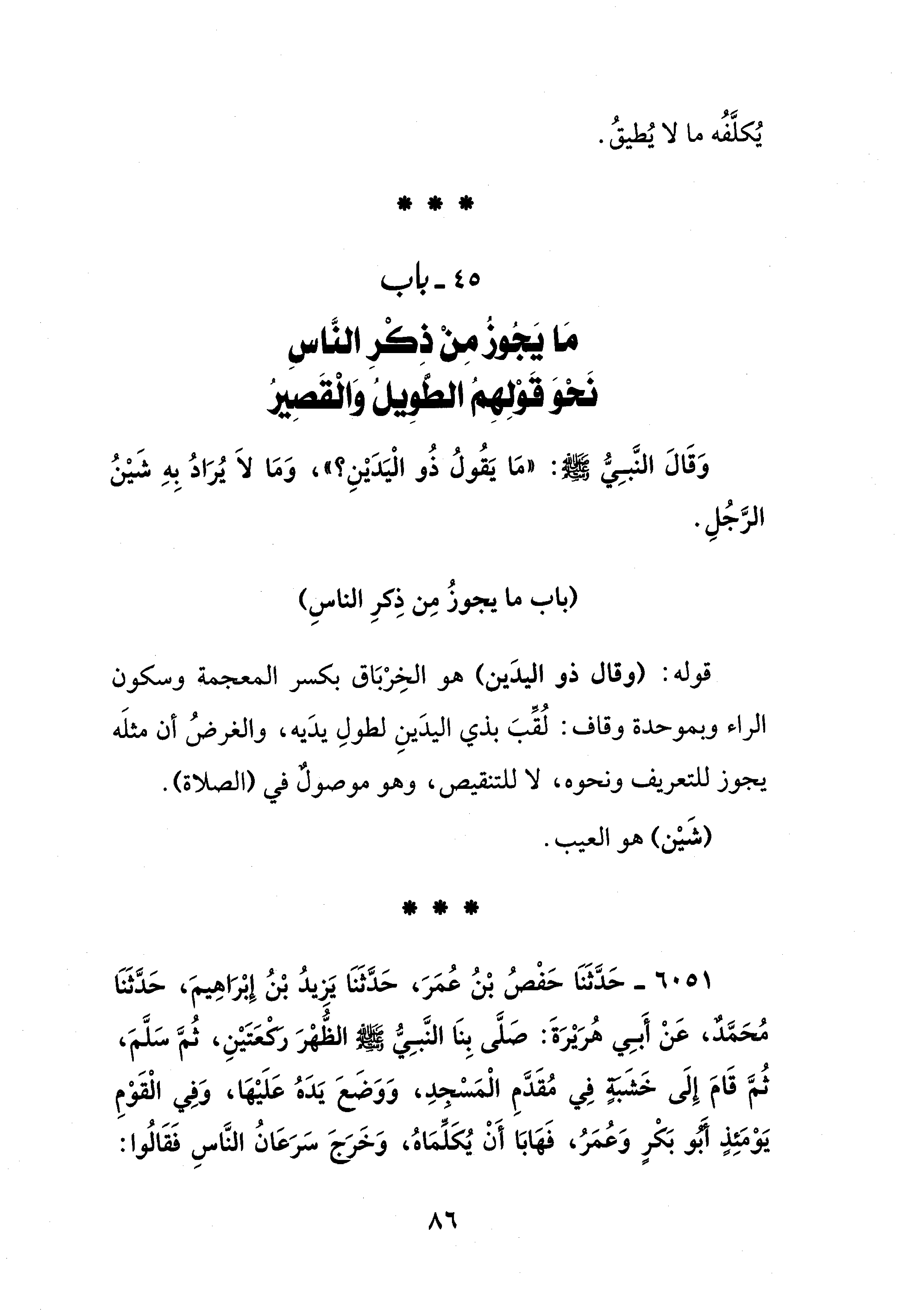 6051 - حَدَّثَنَا حَفْصُ بْنُ عُمَرَ، حَدَّثَنَا يَزِيدُ بْنُ إِبْرَاهِيمَ، حَدَّثَنَا مُحَمَّدٌ، عَنْ أَبِي هُرَيْرَةَ: صَلَّى بِنَا النَّبِيُّ - صلى الله عليه وسلم - الظُّهْرَ رَكْعَتَيْنِ، ثُمَّ سَلَّمَ، ثُمَّ قَامَ إِلَى خَشَبَةٍ فِي مُقَدَّمِ الْمَسْجِدِ، وَوَضَعَ يَدَهُ عَلَيْهَا، وَفِي الْقَوْمِ يَوْمَئِذٍ أَبُو بَكْرٍ وَعُمَرُ، فَهَابَا أَنْ يُكَلِّمَاهُ، وَخَرَجَ سَرَعَانُ النَّاسِ فَقَالُوا: