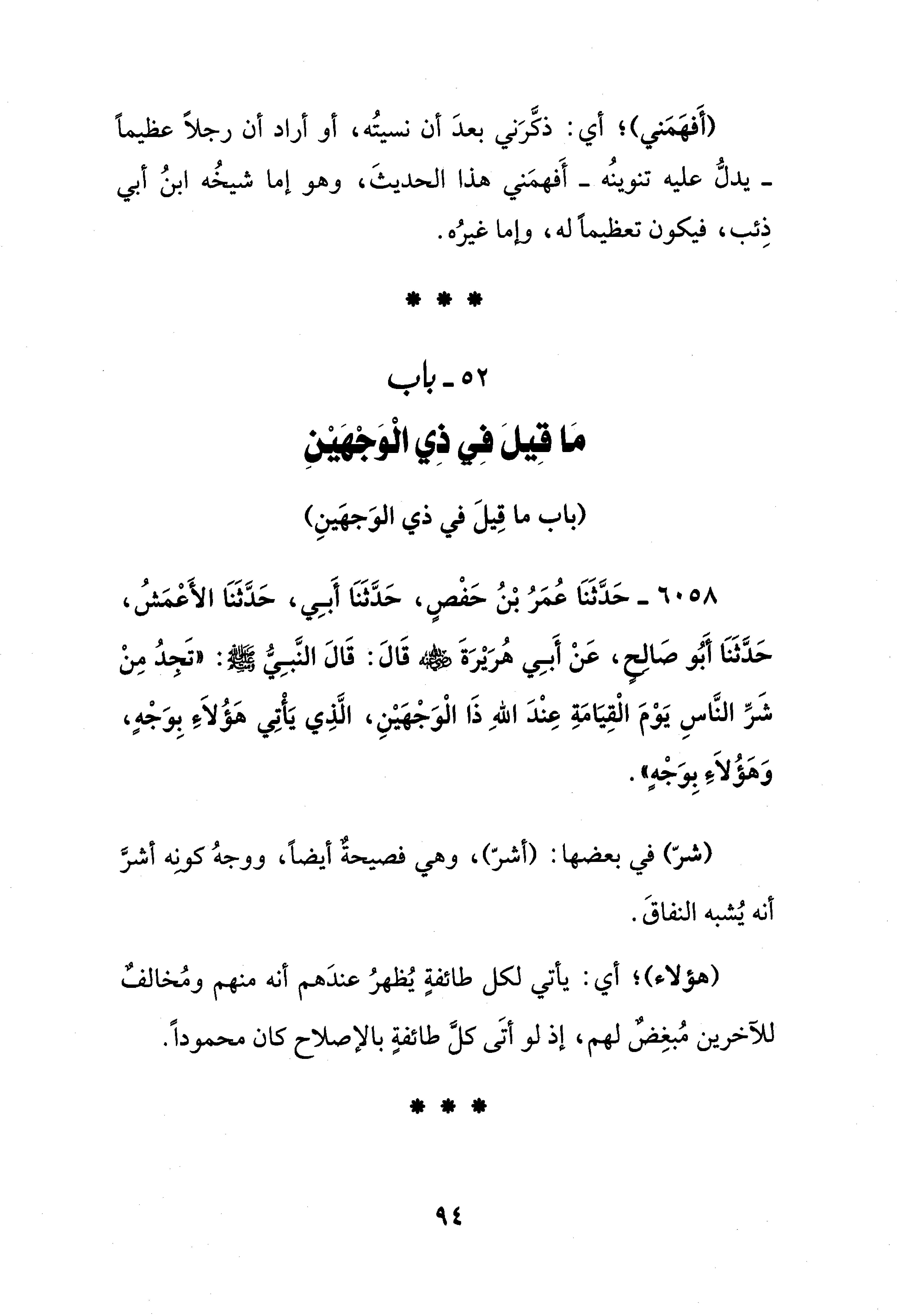 6058 - حَدَّثَنَا عُمَرُ بْنُ حَفْصٍ، حَدَّثَنَا أَبِي، حَدَّثَنَا الأَعْمَشُ، حَدَّثَنَا أَبُو صَالحٍ، عَنْ أَبِي هُرَيرَةَ - رضي الله عنه - قَالَ: قَالَ النَّبِيُّ - صلى الله عليه وسلم -: "تَجِدُ مِنْ شَرِّ النَّاسِ يَوْمَ الْقِيَامَةِ عِنْدَ اللهِ ذَا الْوَجْهَيْنِ، الَّذِي يَأْتِي هَؤُلاَءِ بِوَجْهٍ، وَهَؤُلاَءِ بِوَجْهٍ".
