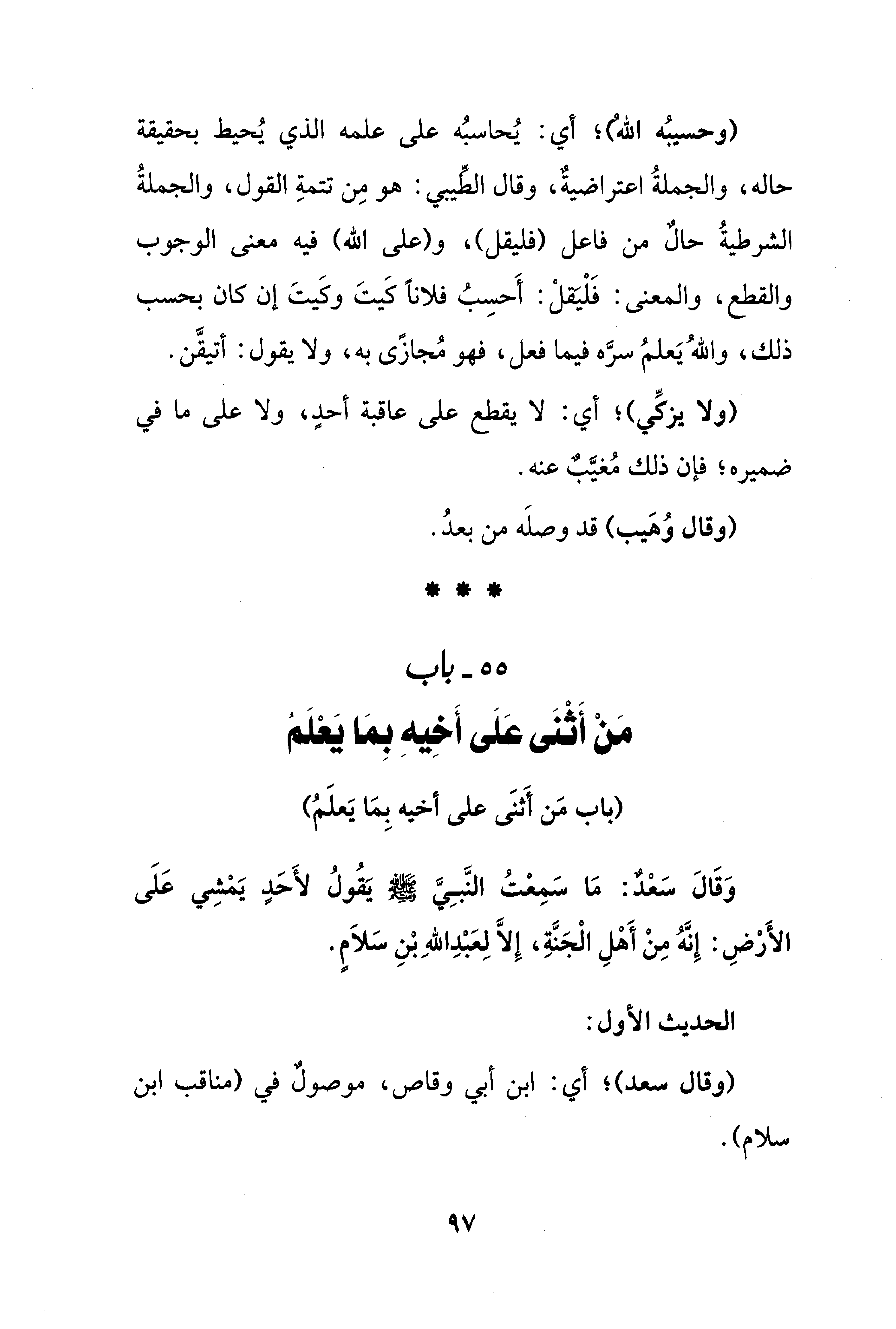 وَقَالَ سَعْدٌ: مَا سَمِعْتُ النَّبِيَّ - صلى الله عليه وسلم - يَقُولُ لأَحَدٍ يَمْشِي عَلَى الأَرْضِ: إِنَّهُ مِنْ أَهْلِ الْجَنَّةِ، إِلَّا لِعَبْدِ اللهِ بْنِ سَلاَمٍ.