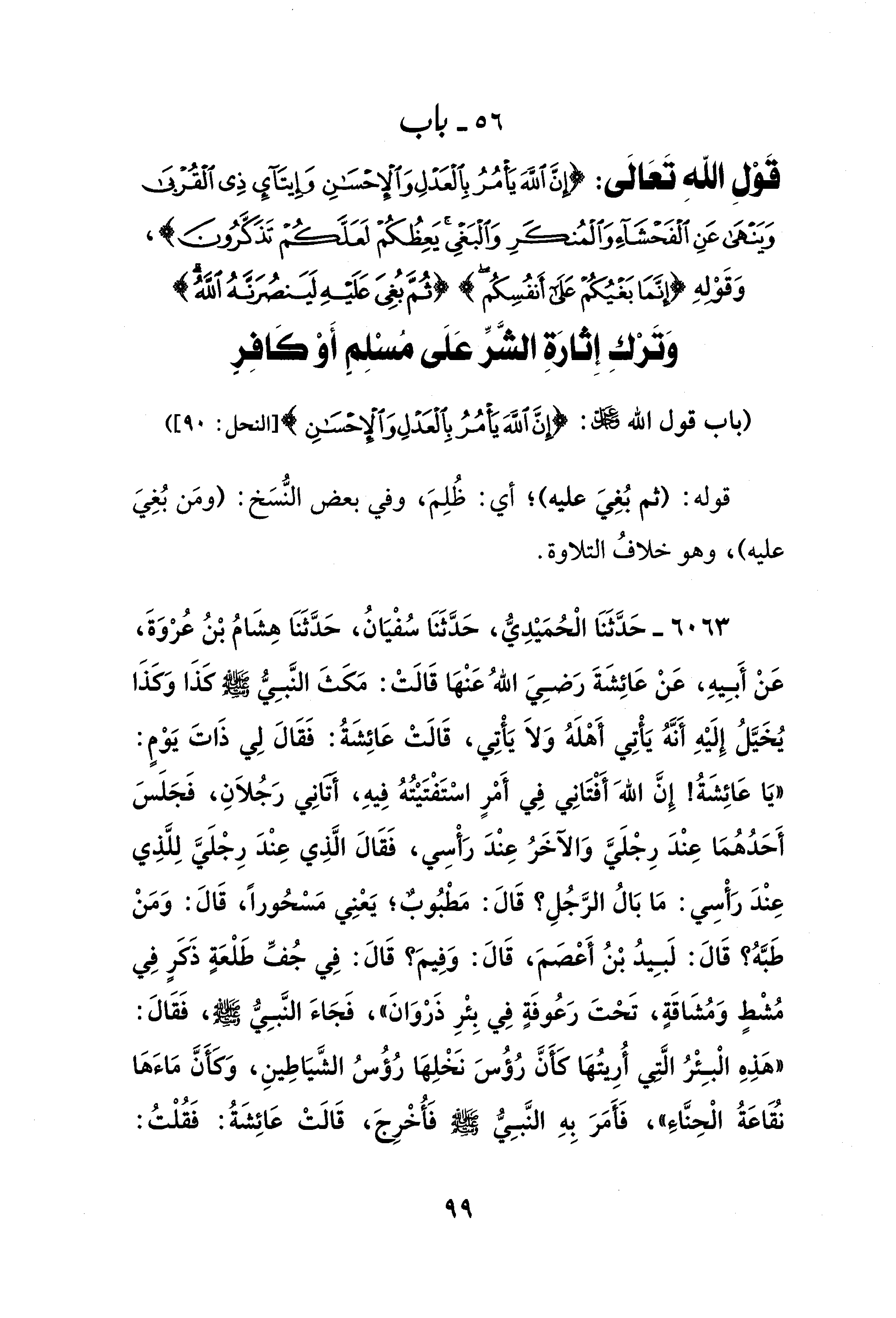 56 - باب قَوْلِ الله تَعالَى: {إِنَّ اللَّهَ يَأْمُرُ بِالْعَدْلِ وَالْإِحْسَانِ وَإِيتَاءِ ذِي الْقُرْبَى وَيَنْهَى عَنِ الْفَحْشَاءِ وَالْمُنْكَرِ وَالْبَغْيِ يَعِظُكُمْ لَعَلَّكُمْ تَذَكَّرُونَ}، وَقَولِهِ {إِنَّمَا بَغْيُكُمْ عَلَى أَنْفُسِكُمْ} {ثُمَّ بُغِيَ عَلَيْهِ لَيَنْصُرَنَّهُ اللَّهُ} وَتَرْكِ إثارَةِ الشَّرِّ عَلَى مُسْلِمٍ أوْ كَافِرٍ