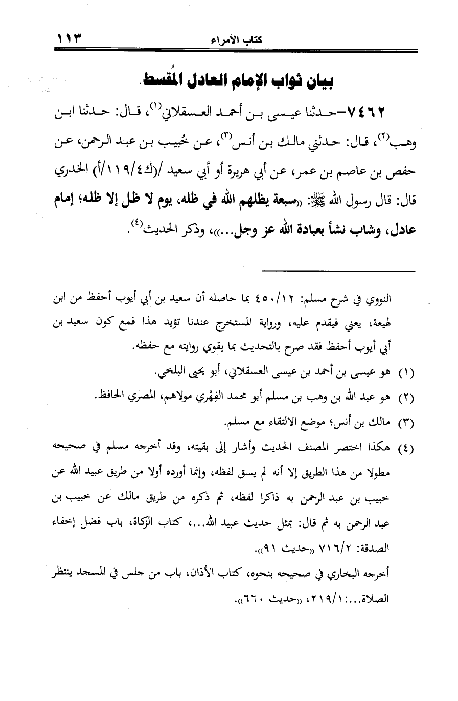 7462 - حدثنا عيسى بن أحمد العسقلاني (¬1)، قال: حدثنا ابن وهب (¬2)، قال: حدثني مالك بن أنس (¬3)، عن خُبيب بن عبد الرحمن، عن حفص بن عاصم بن عمر، عن أبي هريرة أو أبي سعيد الخدري قال: قال رسول الله -صلى الله عليه وسلم-: "سبعة يظلهم الله في ظله، يوم لا ظل إلا ظله؛ إمام عادل، وشاب نشأ بعبادة الله عز وجل ... "، وذكر الحديث (¬4).