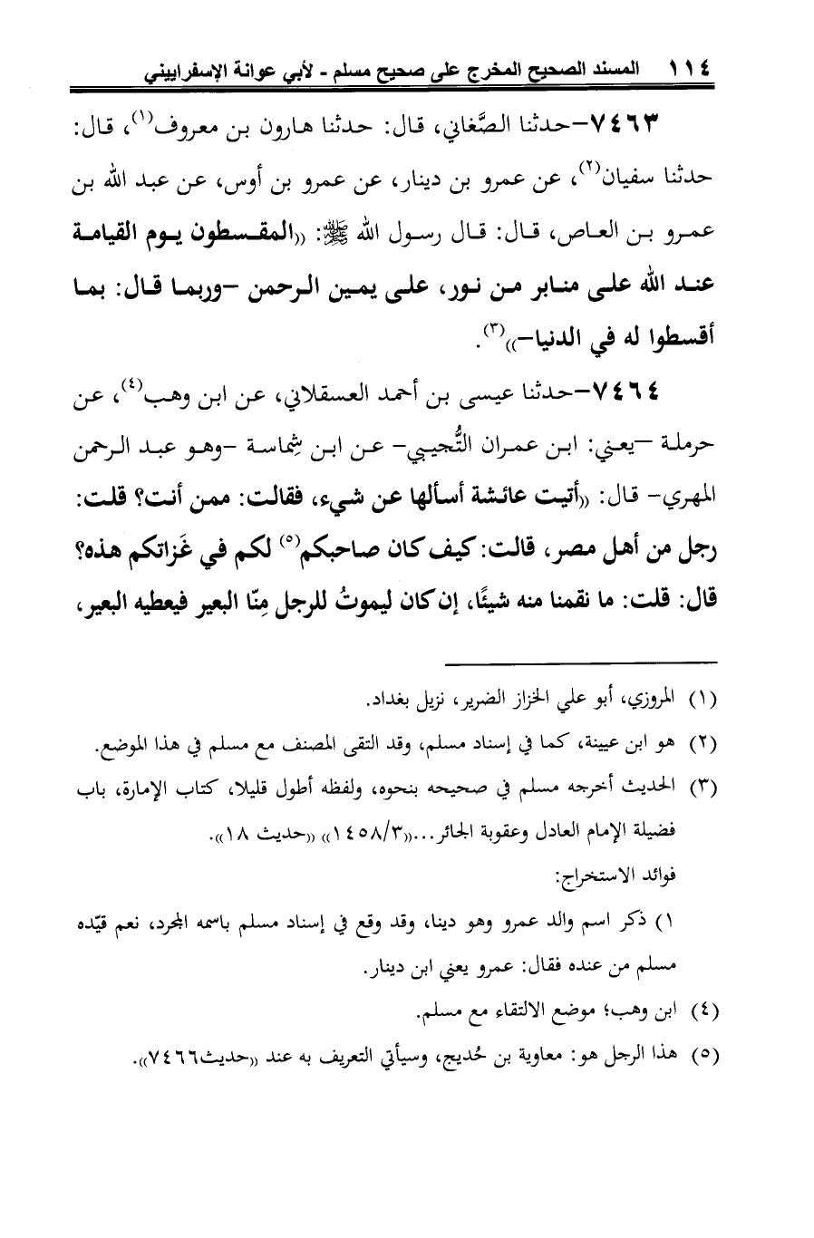 7463 - حدثنا الصَّغاني، قال: حدثنا هارون بن معروف (¬1)، قال: حدثنا سفيان (¬2)، عن عمرو بن دينار، عن عمرو بن أوس، عن عبد الله بن عمرو بن العاص، قال: قال رسول الله -صلى الله عليه وسلم-: "المقسطون يوم القيامة عند الله على منابر من نور، على يمين الرحمن -وربما قال: بما أقسطوا له في الدنيا-" (¬3).