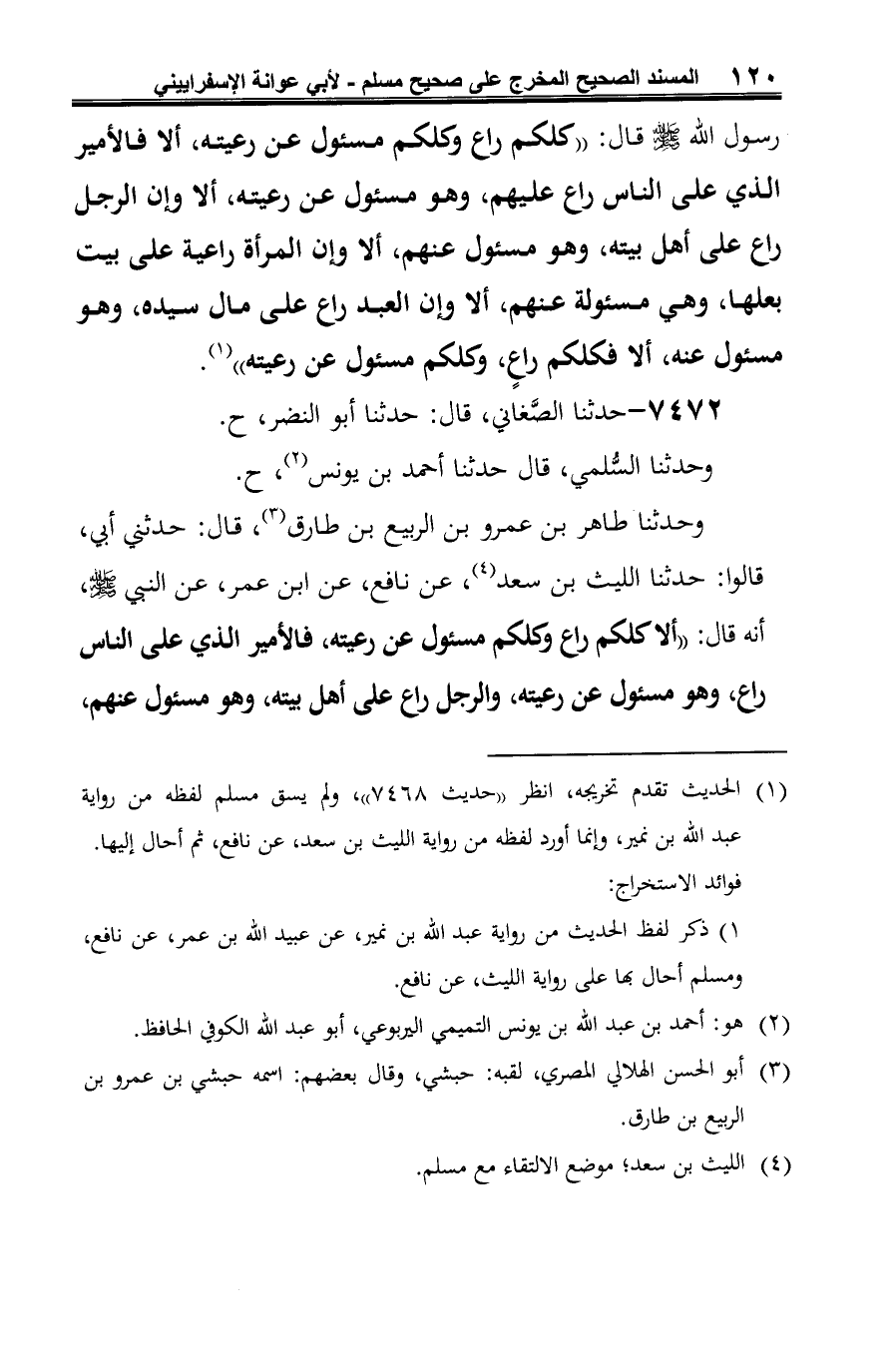 وحدثنا طاهر بن عمرو بن الربيع بن طارق (¬2)، قال: حدثني أبي، قالوا: حدثنا الليث بن سعد (¬3)، عن نافع، عن ابن عمر، عن النبي -صلى الله عليه وسلم-، أنه قال: "ألا كلكم راع وكلكم مسئول عن رعيته، فالأمير الذي على الناس راع، وهو مسئول عن رعيته، والرجل راع على أهل بيته، وهو مسئول عنهم،