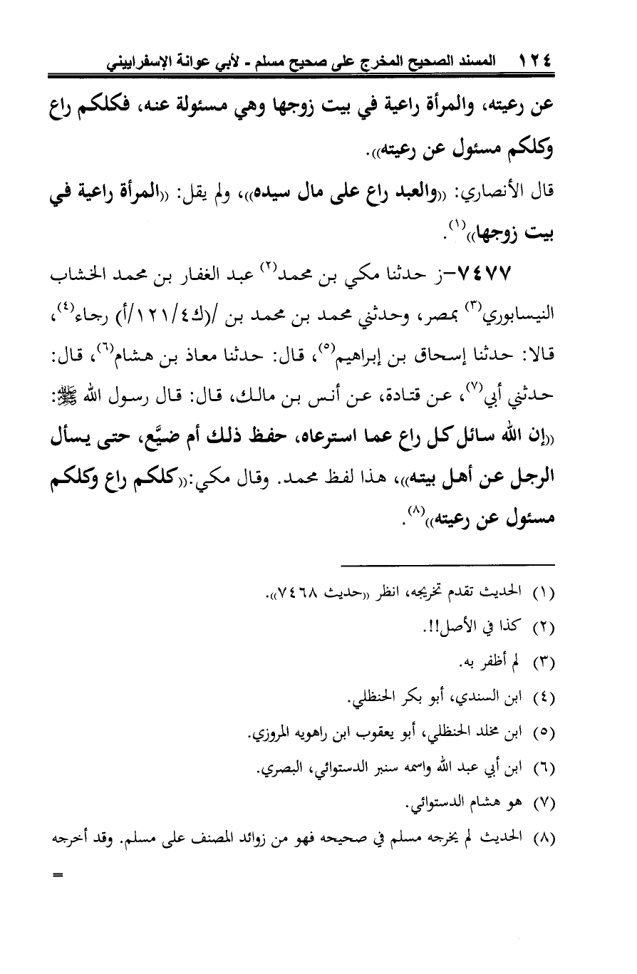 7477 - ز حدثنا مكي بن محمد (¬1) عبد الغفار بن محمد الخشاب النيسابوري (¬2) بمصر، وحدثني محمد بن محمد بن رجاء (¬3)، قالا: حدثنا إسحاق بن إبراهيم (¬4)، قال: حدثنا معاذ بن هشام (¬5)، قال: حدثني أبي (¬6)، عن قتادة، عن أنس بن مالك، قال: قال رسول الله -صلى الله عليه وسلم-: "إن الله سائل كل راع عما استرعاه، حفظ ذلك أم ضيَّع، حتى يسأل الرجل عن أهل بيته"، هذا لفظ محمد. وقال مكي: "كلكم راع وكلكم مسئول عن رعيته" (¬7).