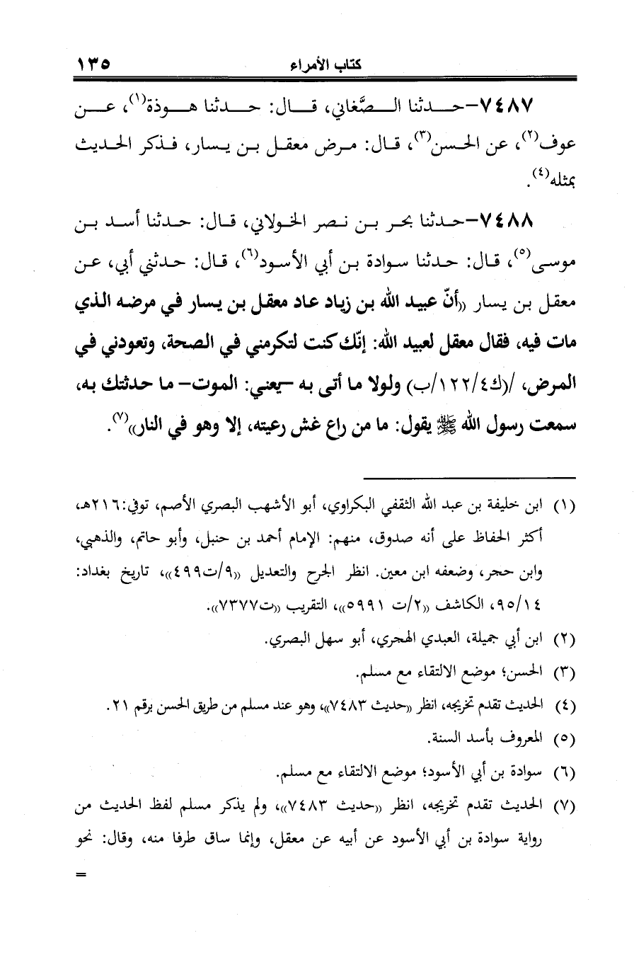 7488 - حدثنا بحر بن نصر الخولاني، قال: حدثنا أسد بن موسى (¬1)، قال: حدثنا سوادة بن أبي الأسود (¬2)، قال: حدثني أبي، عن معقل بن يسار "أنّ عبيد الله بن زياد عاد معقل بن يسار في مرضه الذي مات فيه، فقال معقل لعبيد الله: إنّك كنت لتكرمني في الصحة، وتعودني في المرض، ولولا ما أتى به -يعني: الموت- ما حدثتك به، سمعت رسول الله -صلى الله عليه وسلم- يقول: ما من راع غش رعيته، إلا وهو في النار" (¬3).