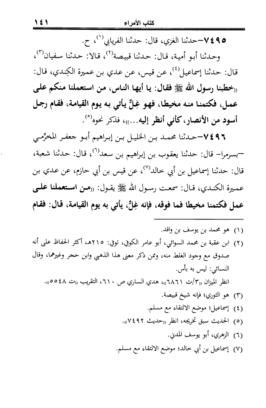 7496 - حدثنا محمد بن الخليل بن إبراهيم أبو جعفر المخرِّمي -بسرمرا- قال: حدثنا يعقوب بن إبراهيم بن سعد (¬1)، قال: حدثنا شعبة، قال: حدثنا إسماعيل بن أبي خالد (¬2)، عن قيس بن أبي حازم، عن عدي بن عميرة الكندي، قال: سمعت رسول الله -صلى الله عليه وسلم- يقول: "من استعملنا على عمل فكتمنا مخيطا فما فوقه، فإنه غِلٌّ، يأتي به يوم القيامة، قال: فقام