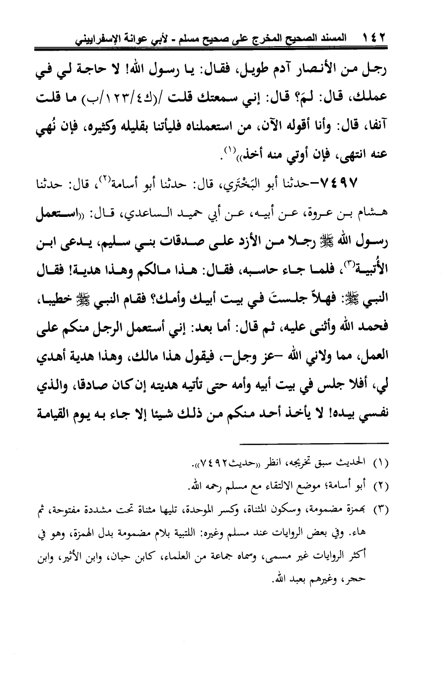 (¬3) الحديث أخرجه مسلم في صحيحه بنحوه، كتاب الإمارة، باب تحريم هدايا العمال: 3/ 1463، "حديث 27".