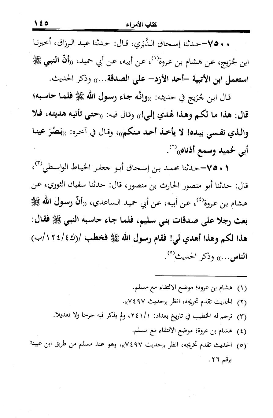 7500 - حدثنا إسحاق الدَّبَري، قال: حدثنا عبد الرزاق، أخبرنا ابن جُرَيج، عن هشام بن عروة (¬1)، عن أبيه، عن أبي حميد، "أنّ النبي -صلى الله عليه وسلم- استعمل ابن الأتبية -أحد الأزد- على الصدقة ... " وذكر الحديث.