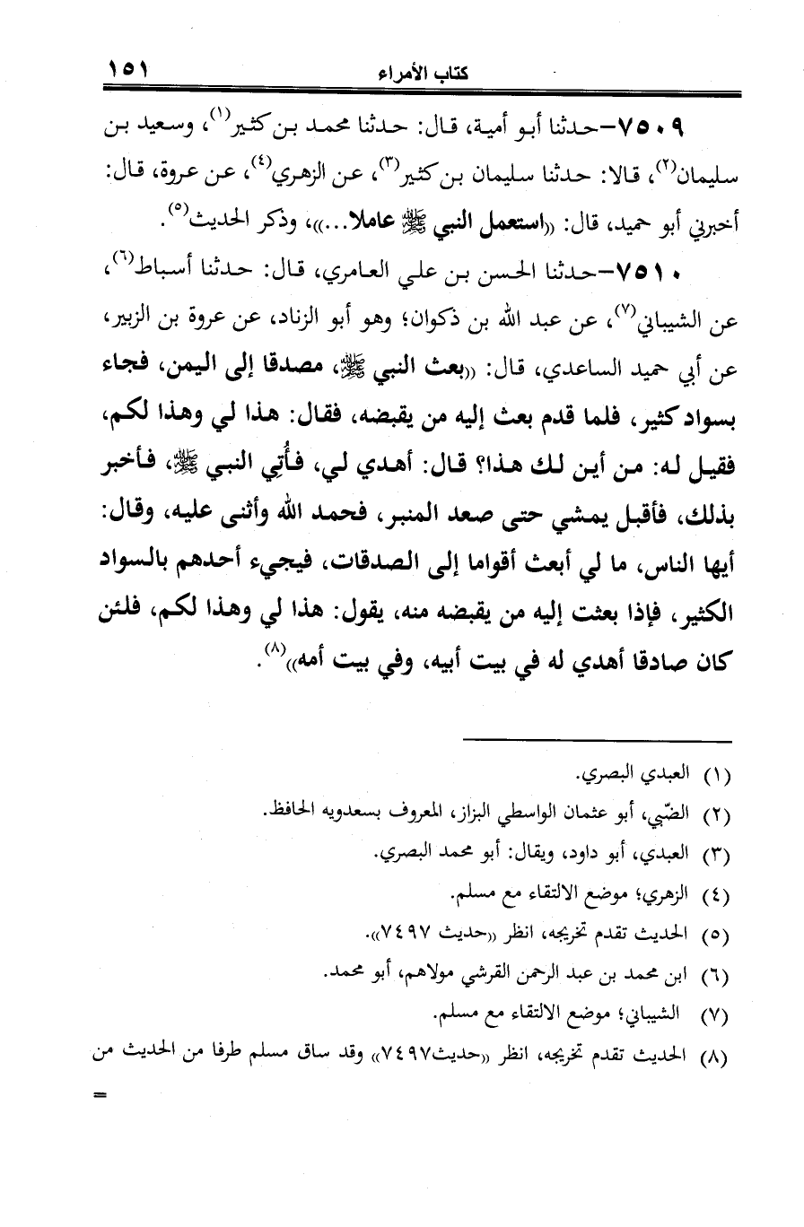 7509 - حدثنا أبو أمية، قال: حدثنا محمد بن كثير (¬1)، وسعيد بن سليمان (¬2)، قالا: حدثنا سليمان بن كثير (¬3)، عن الزهري (¬4)، عن عروة، قال: أخبرني أبو حميد، قال: "استعمل النبي -صلى الله عليه وسلم- عاملا ... "، وذكر الحديث (¬5).