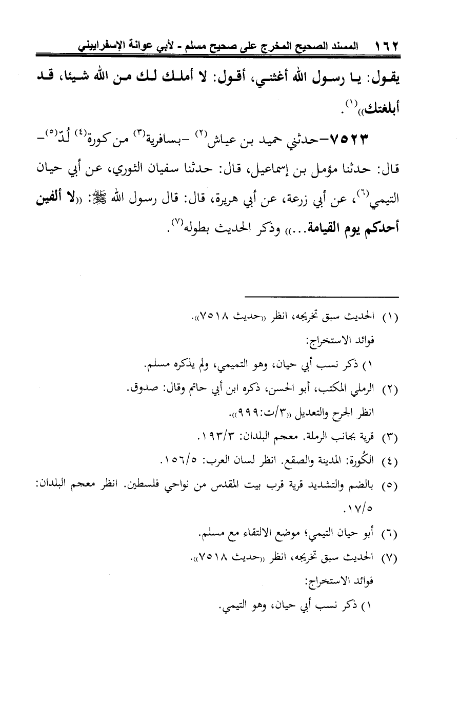 7523 - حدثني حميد بن عياش (¬1) -بسافرية (¬2) من كورة (¬3) لُدّ (¬4) - قال: حدثنا مؤمل بن إسماعيل، قال: حدثنا سفيان الثوري، عن أبي حيان التيمي (¬5)، عن أبي زرعة، عن أبي هريرة، قال: قال رسول الله -صلى الله عليه وسلم-: "لا ألفين أحدكم يوم القيامة ... " وذكر الحديث بطوله (¬6).