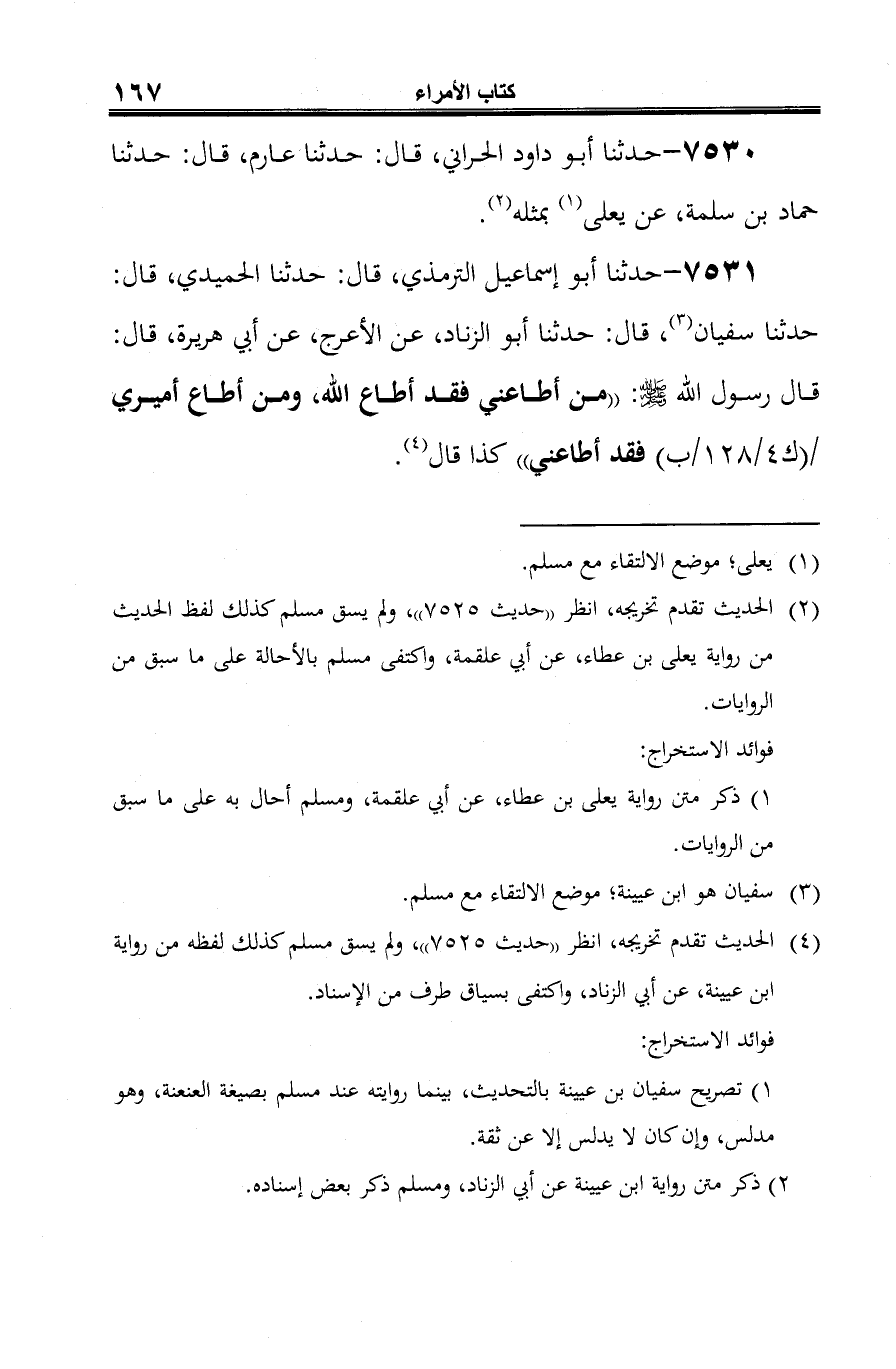 7531 - حدثنا أبو إسماعيل الترمذي، قال: حدثنا الحميدي، قال: حدثنا سفيان (¬1)، قال: حدثنا أبو الزناد، عن الأعرج، عن أبي هريرة، قال: قال رسول الله -صلى الله عليه وسلم-: "من أطاعني فقد أطاع الله، ومن أطاع أميري فقد أطاعني" كذا قال (¬2).