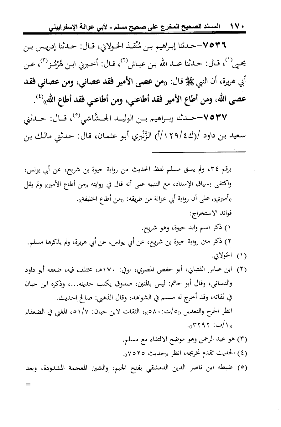 7536 - حدثنا إبراهيم بن مُنْقذ الخولاني، قال: حدثنا إدريس بن يحيى (¬1)، قال: حدثنا عبد الله بن عياش (¬2)، قال: أخبرني ابن هُرْمُز (¬3)، عن أبي هريرة، أن النبي -صلى الله عليه وسلم- قال: "من عصى الأمير فقد عصاني، ومن عصاني فقد عصى الله، ومن أطع الأمير فقد أطاعني، ومن أطاعني فقد أطاع الله" (¬4).