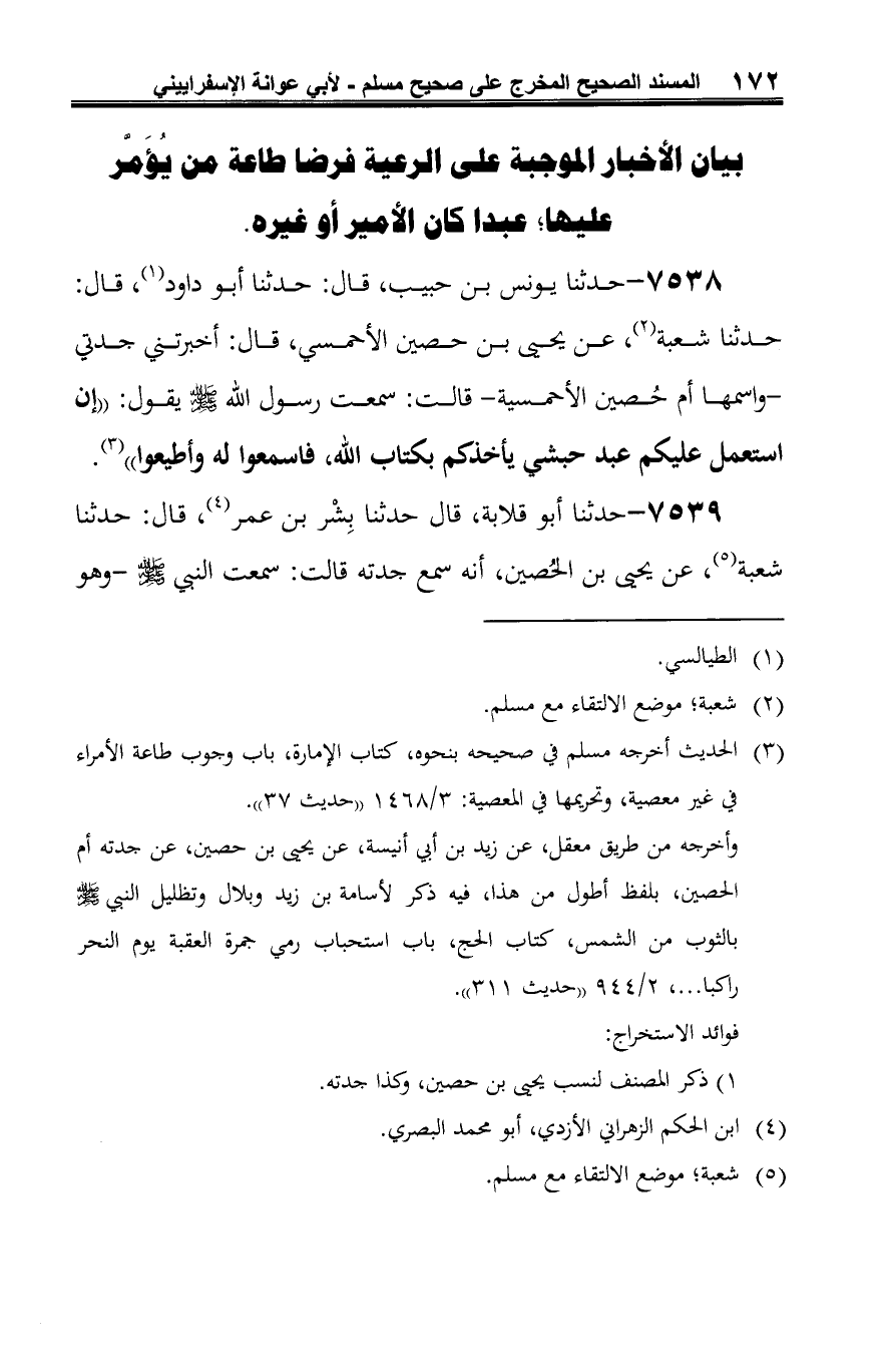 7538 - حدثنا يونس بن حبيب، قال: حدثنا أبو داود (¬1)، قال: حدثنا شعبة (¬2)، عن يحيى بن حصين الأحمسي، قال: أخبرتني جدتي -واسمها أم حُصين الأحمسية- قالت: سمعت رسول الله -صلى الله عليه وسلم- يقول: "إن استعمل عليكم عبد حبشي يأخذكم بكتاب الله، فاسمعوا له وأطيعوا" (¬3).