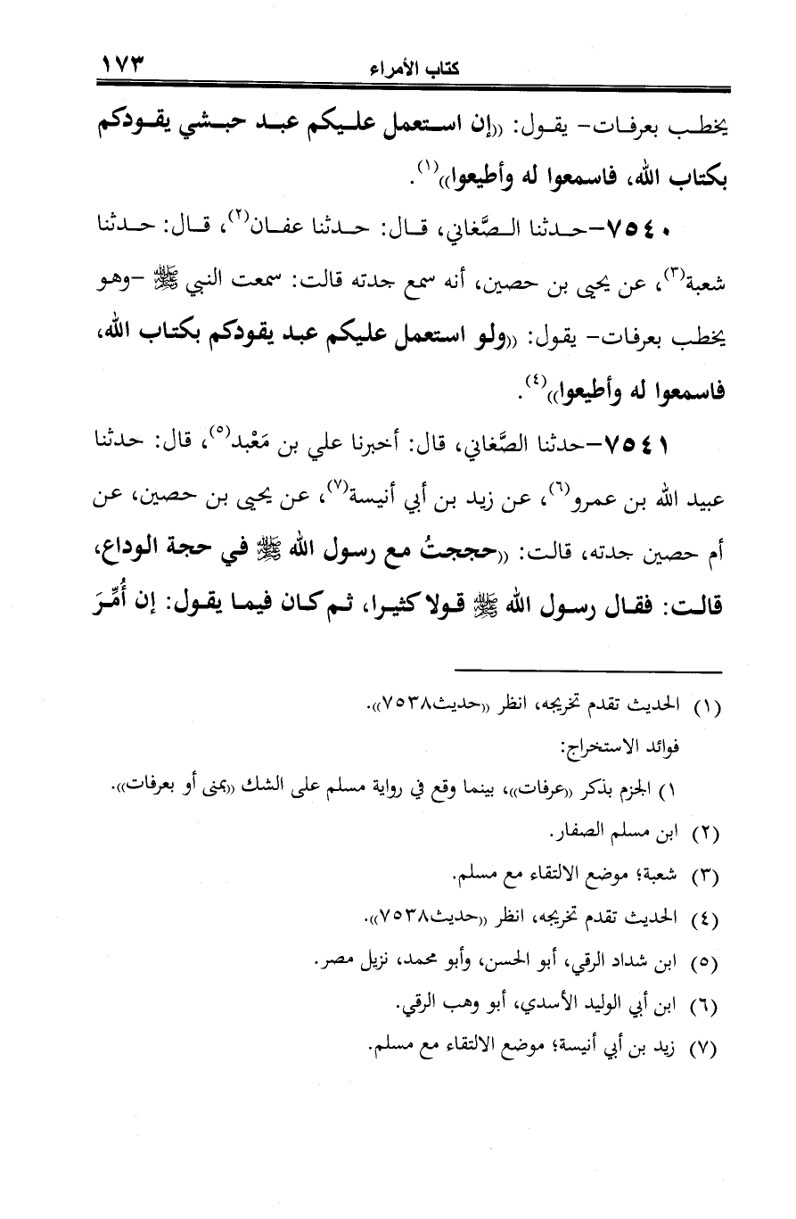 7540 - حدثنا الصَّغاني، قال: حدثنا عفان (¬1)، قال: حدثنا شعبة (¬2)، عن يحيى بن حصين، أنه سمع جدته قالت: سمعت النبي -صلى الله عليه وسلم-وهو يخطب بعرفات- يقول: "ولو استعمل عليكم عبد يقودكم بكتاب الله، فاسمعوا له وأطيعوا" (¬3).
