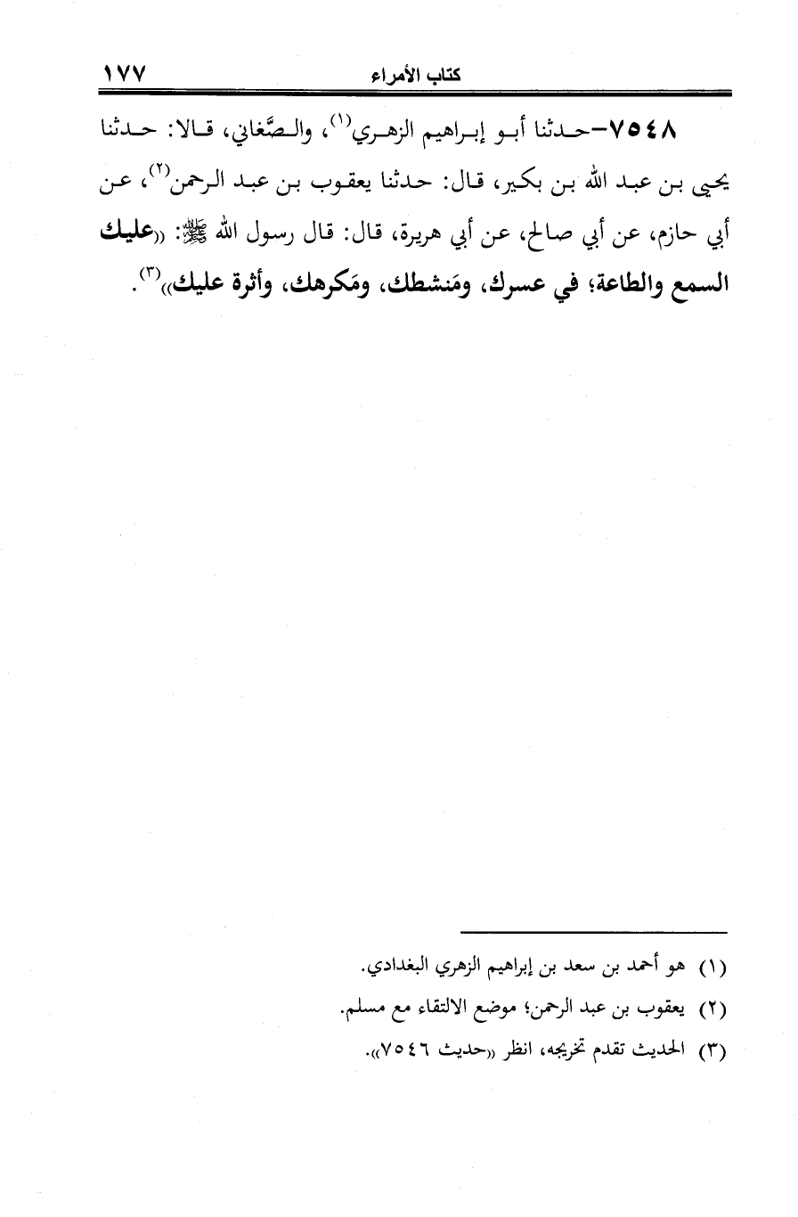 7548 - حدثنا أبو إبراهيم الزهري (¬1)، والصَّغاني، قالا: حدثنا يحيى بن عبد الله بن بكير، قال: حدثنا يعقوب بن عبد الرحمن (¬2)، عن أبي حازم، عن أبي صالح، عن أبي هريرة، قال: قال رسول الله -صلى الله عليه وسلم-: "عليك السمع والطاعة؛ في عسرك، ومَنشطك، ومَكرهك، وأثرة عليك" (¬3).