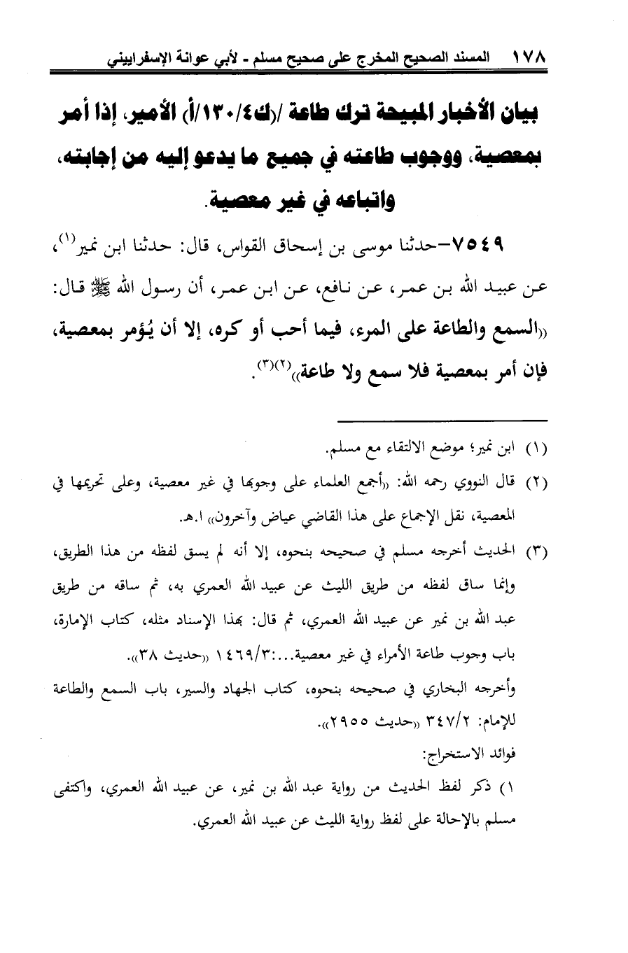 7549 - حدثنا موسى بن إسحاق القواس، قال: حدثنا ابن نمير (¬1)، عن عبيد الله بن عمر، عن نافع، عن ابن عمر، أن رسول الله -صلى الله عليه وسلم- قال: "السمع والطاعة على المرء، فيما أحب أو كره، إلا أن يُؤمر بمعصية، فإن أمر بمعصية فلا سمع ولا طاعة" (¬2) (¬3).