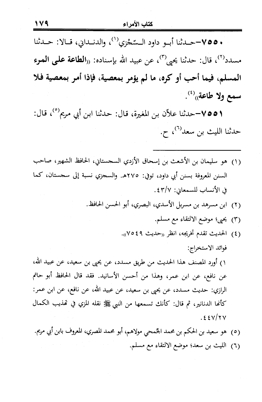 7550 - حدثنا أبو داود السّجْزي (¬1)، والدنداني، قالا: حدثنا مسدد (¬2)، قال: حدثنا يحيى (¬3)، عن عبيد الله بإسناده: "الطاعة على المرء المسلم، فيما أحب أو كره، ما لم يؤمر بمعصية، فإذا أمر بمعصية فلا سمع ولا طاعة" (¬4).
