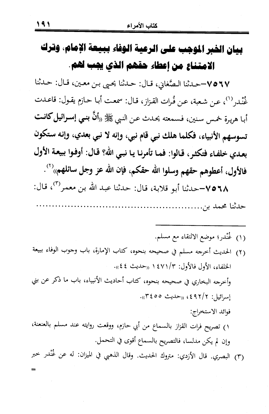 7567 - حدثنا الصَّغاني، قال: حدثنا يحيى بن معين، قال: حدثنا غُنْدر (¬1)، عن شعبة، عن فُرات القزاز، قال: سمعت أبا حازم يقول: قاعدت أبا هريرة خمس سنين، فسمعته يحدث عن النبي -صلى الله عليه وسلم- "أنَّ بني إسرائيل كانت تسوسهم الأنبياء، فكلما هلك نبي قام نبي، وإنه لا نبي بعدي، وإنه ستكون بعدي خلفاء فتكثر، قالوا: فما تأمرنا يا نبي الله؟ قال: أوفوا ببيعة الأول فالأول، أعطوهم حقهم وسلوا الله حقكم، فإن الله عز وجل سائلهم" (¬2).