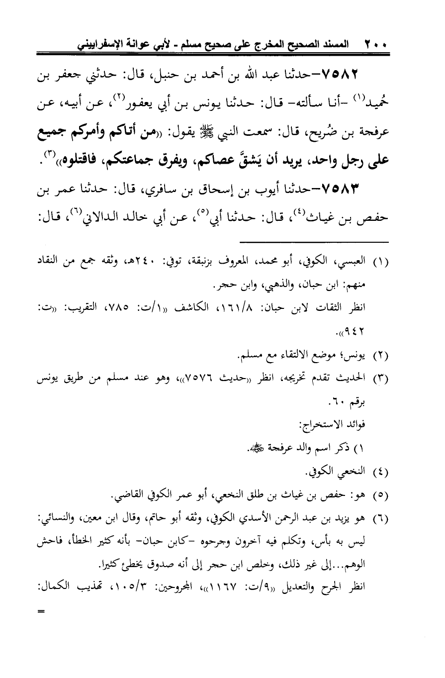 7582 - حدثنا عبد الله بن أحمد بن حنبل، قال: حدثني جعفر بن حُميد (¬1) -أنا سألته- قال: حدثنا يونس بن أبي يعفور (¬2)، عن أبيه، عن عرفجة بن ضُريح، قال: سمعت النبي -صلى الله عليه وسلم- يقول: "من أتاكم وأمركم جميع على رجل واحد، يريد أن يَشقَّ عصاكم، ويفرق جماعتكم، فاقتلوه" (¬3).
