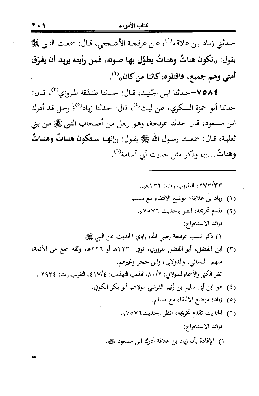 7584 - حدثنا ابن الجُنيد، قال: حدثنا صَدَقة المروزي (¬1)، قال: حدثنا أبو حمزة السكري، عن ليث (¬2)، قال: حدثنا زياد (¬3)؛ رجل قد أدرك ابن مسعود، قال حدثنا عرفجة، وهو رجل من أصحاب النبي -صلى الله عليه وسلم- من بني ثعلبة، قال: سمعت رسول الله -صلى الله عليه وسلم- يقول: "إنها ستكون هناتٌ وهناتٌ وهناتٌ ... "، وذكر مثل حديث أبي أسامة (¬4).