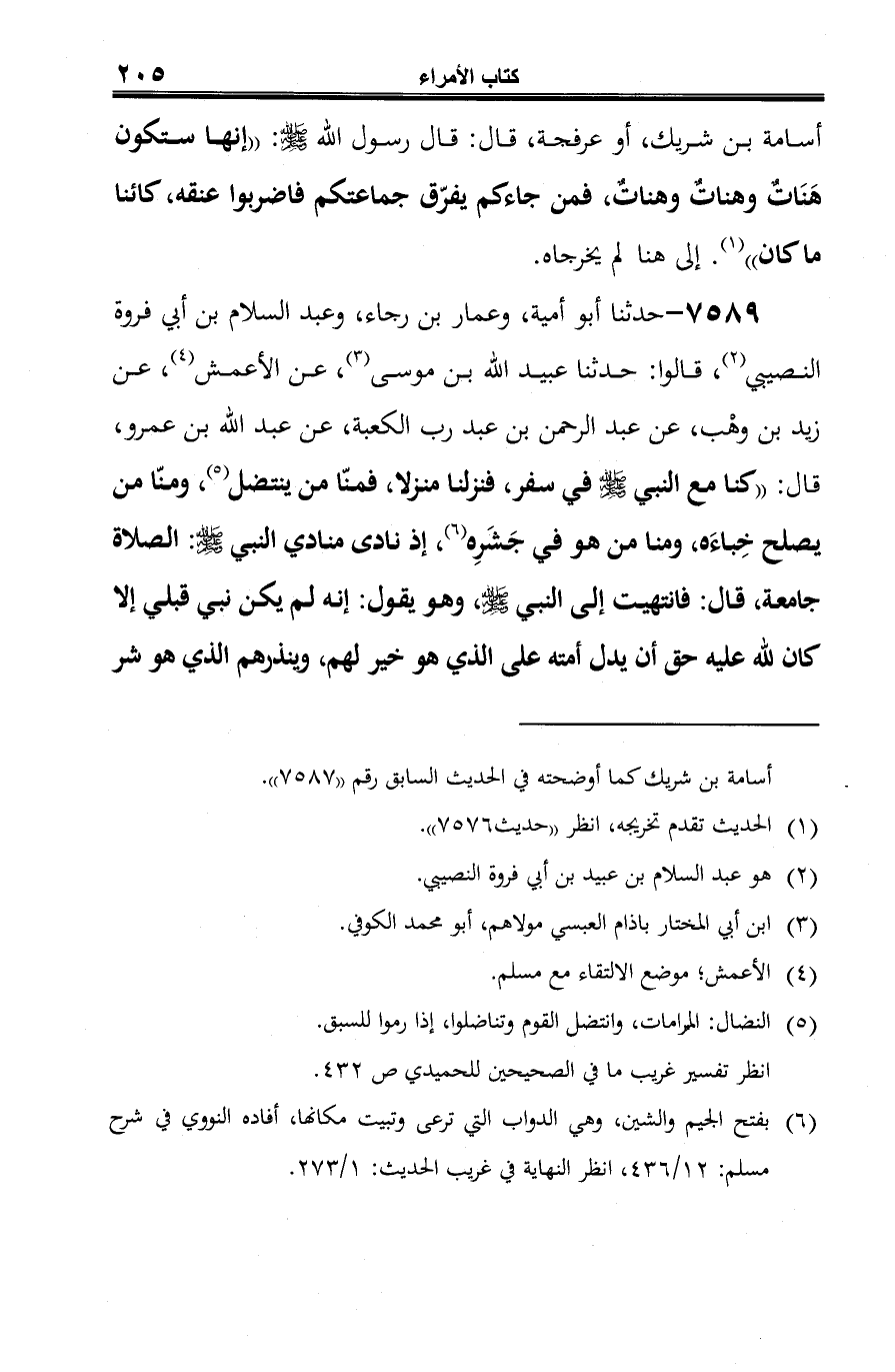 7589 - حدثنا أبو أمية، وعمار بن رجاء، وعبد السلام بن أبي فروة النصيبي (¬1)، قالوا: حدثنا عبيد الله بن موسى (¬2)، عن الأعمش (¬3)، عن زيد بن وهْب، عن عبد الرحمن بن عبد رب الكعبة، عن عبد الله بن عمرو، قال: "كنا مع النبي -صلى الله عليه وسلم- في سفر، فنزلنا منزلا، فمنّا من ينتضل (¬4) , ومنّا من يصلح خِباءَه، ومنا من هو في جَشَرِه (¬5)، إذ نادى منادي النبي -صلى الله عليه وسلم-: الصلاة جامعة، قال: فانتهيت إلى النبي -صلى الله عليه وسلم-، وهو يقول: إنه لم يكن نبي قبلي إلا كان لله عليه حق أن يدل أمته على الذي هو خير لهم، وينذرهم الذي هو شر