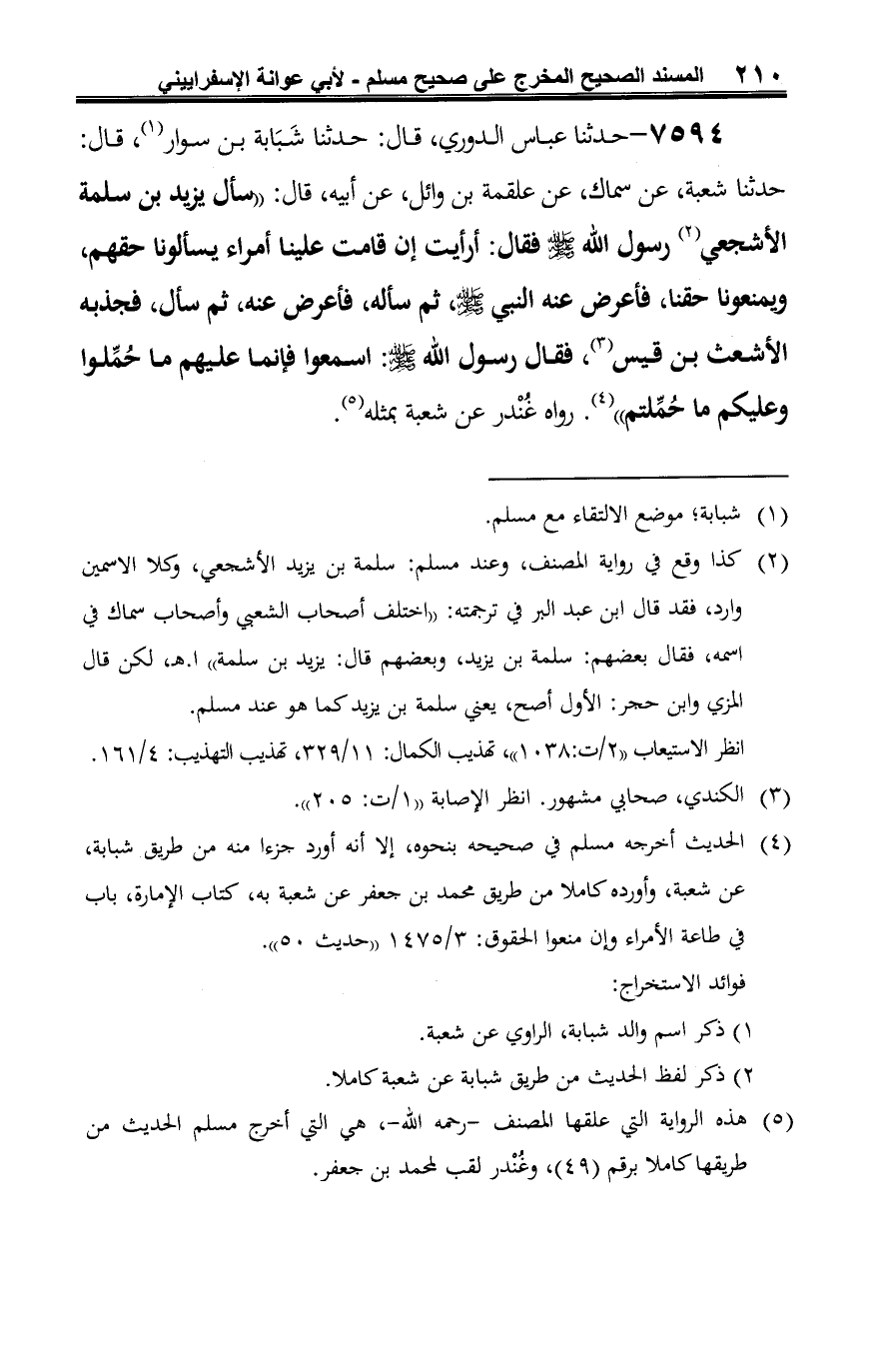 7594 - حدثنا عباس الدوري، قال: حدثنا شَبَابة بن سوار (¬1)، قال: حدثنا شعبة، عن سماك، عن علقمة بن وائل، عن أبيه، قال: "يسأل يزيد بن سلمة الأشجعي (¬2) رسول الله -صلى الله عليه وسلم- فقال: أرأيت إن قامت علينا أمراء يسألونا حقهم، ويمنعونا حقنا، فأعرض عنه النبي -صلى الله عليه وسلم-، ثم سأله، فأعرض عنه، ثم سأل، فجذبه الأشعث بن قيس (¬3)، فقال رسول الله -صلى الله عليه وسلم-: اسمعوا فإنما عليهم ما حُمِّلوا وعليكم ما حُمِّلتم" (¬4). رواه غُنْدر عن شعبة بمثله (¬5).