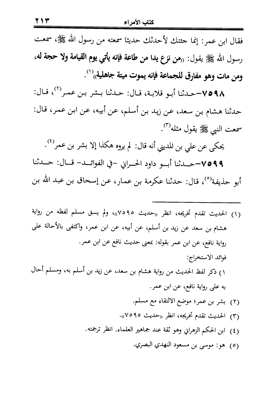 -[214]- أبي طلحة (¬2)، عن زيد بن أسلم (¬3)، عن أبيه، عن ابن عمر، أنّه قال لابن مطيع: إني سمعت رسول الله -صلى الله عليه وسلم- يقول: "من نزع يدا من طاعة فلا حجة له يوم القيامة، ومن مات مفارقا للجماعة، فميتة جاهلية" (¬4).