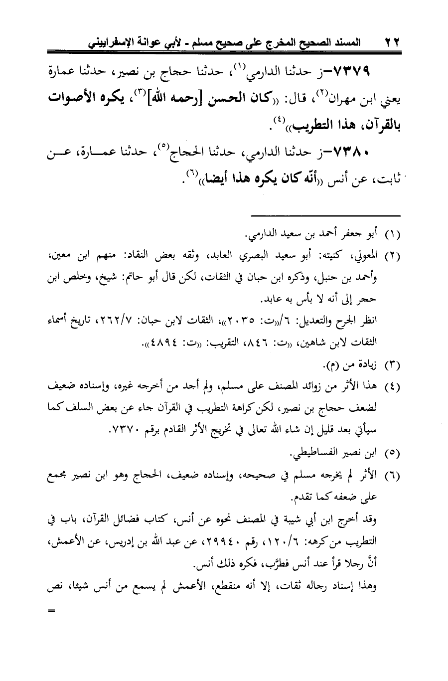 7379 - ز حدثنا الدارمي (¬1)، حدثنا حجاج بن نصير، حدثنا عمارة يعني ابن مهران (¬2)، قال: "كان الحسن [رحمه الله] (¬3)، يكره الأصوات بالقرآن، هذا التطريب" (¬4).