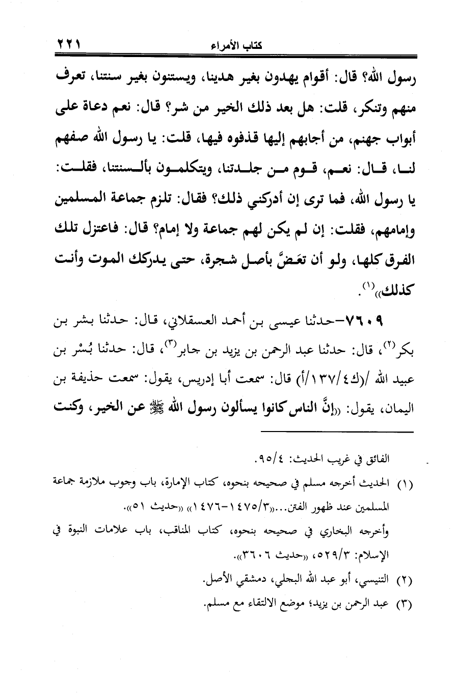 -[222]- أسأله عن الشر، فقلت: يا رسول الله، إنا كنا أقواما ضلالا بشَرٍّ، فجاء الله بهذا الخير، وجاء بك، فهل بعد ذلك الشر من خير؟ قال: نعم، وفيه دخن، قلت: وما دخنه يا رسول الله؟ قال أقوام يهدون بغير هدينا، ويستنون بغير سنتنا، وتعرف منهم وتنكر، قلت: هل بعد ذلك الخير من شر؟ قال: نعم، دعاة على أبواب جهنم، من أجابهم قذفوه فيها، قلت: يا رسول الله، صفهم لنا، قال: نعم؛ قوم من جلدتنا، ويتكلمون بألسنتنا، قلت: يا رسول الله فما ترى إن أدركني ذلك؟ قال: تلزم جماعة المسلمين وإمامهم، فقلت: إن لم يكن لهم جماعة ولا إمام؟ قال فاعتزل تلك الفرق، وإن أدركك أجلك وأنت عاض بأصل شجرة " (¬3).