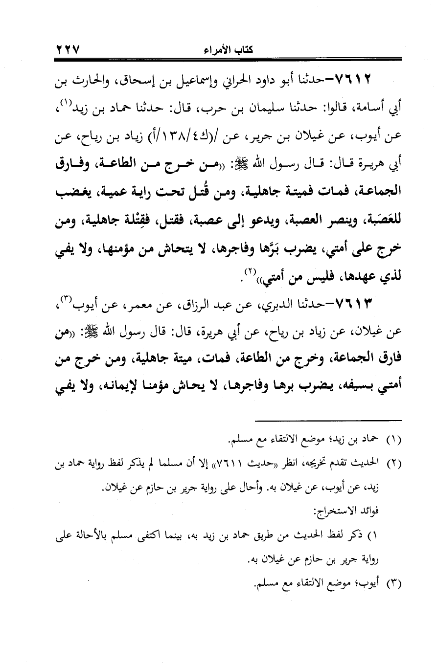 7612 - حدثنا أبو داود الحراني وإسماعيل بن إسحاق، والحارث بن أبي أسامة، قالوا: حدثنا سليمان بن حرب، قال: حدثنا حماد بن زيد (¬1)، عن أيوب، عن غيلان بن جرير، عن زياد بن رياح، عن أبي هريرة قال -رضي الله عنه-: قال رسول الله -صلى الله عليه وسلم-: "من خرج من الطاعة، وفارق الجماعة، فمات فميتة جاهلية، ومن قُتل تحت راية عمية، يغضب للعَصَبة، وينصر العصبة، ويدعو إلى عصبة، فقتل، فقِتْلة جاهلية، ومن خرج على أمتي، يضرب بَرَّها وفاجرها، لا يتحاش من مؤمنها، ولا يفي لذي عهدها، فليس من أمتي" (¬2).
