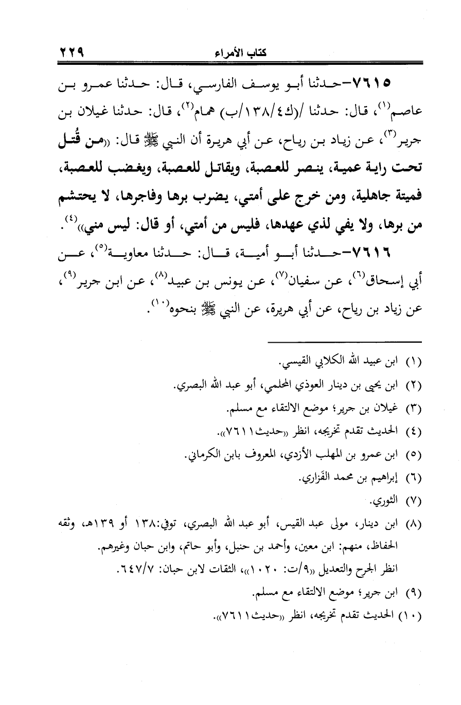 7615 - حدثنا أبو يوسف الفارسي، قال: حدثنا عمرو بن عاصم (¬1)، قال: حدثنا همام (¬2)، قال: حدثنا غيلان بن جرير (¬3)، عن زياد بن رياح، عن أبي هريرة أن النبي -صلى الله عليه وسلم- قال: "من قتل تحت راية عمية، ينصر للعصبة، ويقاتل للعصبة، ويغضب للعصبة، فميتة جاهلية، ومن خرج على أمتي، يضرب برها وفاجرها، لا يحتشم من برها، ولا يفي لذي عهدها، فليس من أمتي، أو قال: ليس مني" (¬4).