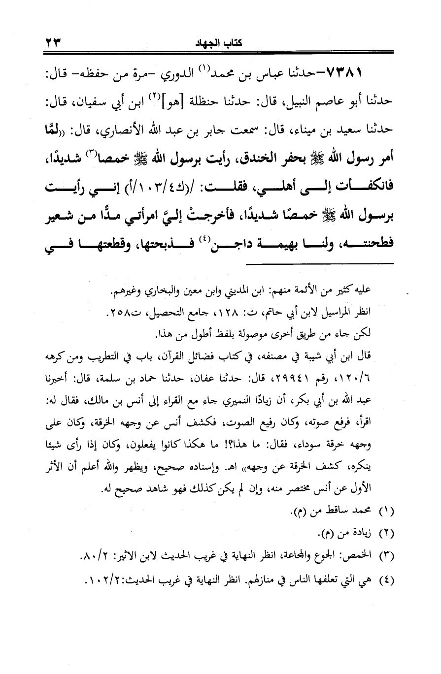 7381 - حدثنا عباس بن محمد (¬1) الدوري -مرة من حفظه- قال: حدثنا أبو عاصم النبيل، قال: حدثنا حنظلة [هو] (¬2) ابن أبي سفيان، قال: حدثنا سعيد بن ميناء، قال: سمعت جابر بن عبد الله الأنصاري، قال: "لمَّا أمر رسول الله -صلى الله عليه وسلم- بحفر الخندق، رأيت برسول الله -صلى الله عليه وسلم- خمصا (¬3) شديدًا، فانكفأت إلى أهلي، فقلت: إني رأيت برسول الله -صلى الله عليه وسلم- خمصًا شديدًا، فأخرجتْ إلي امرأتي مدًّا من شعير فطحنته، ولنا بهيمة داجن (¬4) فذبحتها، وقطعتها في