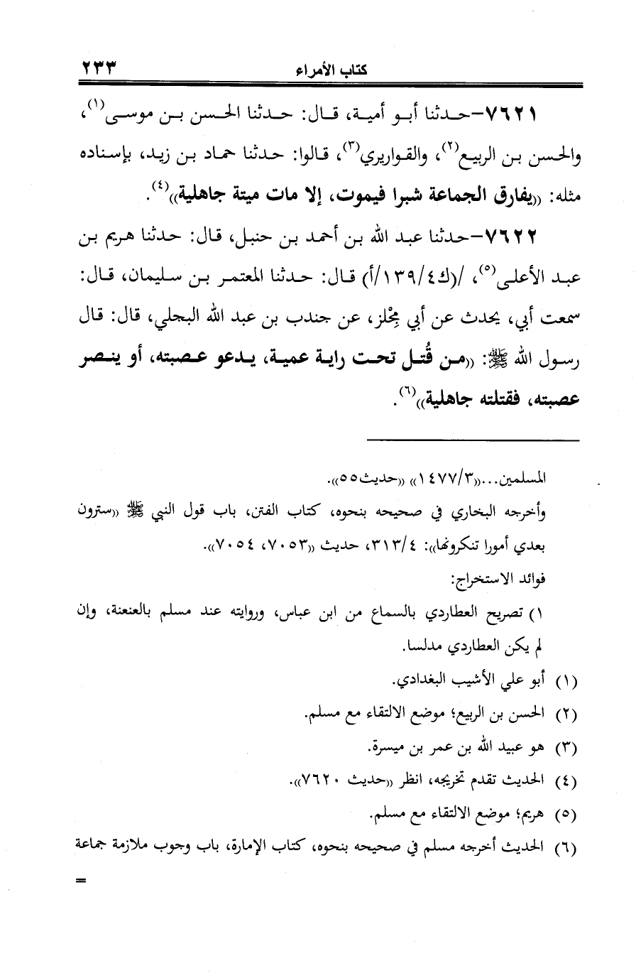 7621 - حدثنا أبو أمية، قال: حدثنا الحسن بن موسى (¬1)، والحسن بن الربيع (¬2)، والقواريري (¬3)، قالوا: حدثنا حماد بن زيد، بإسناده مثله: "يفارق الجماعة شبرا فيموت، إلا مات ميتة جاهلية" (¬4).