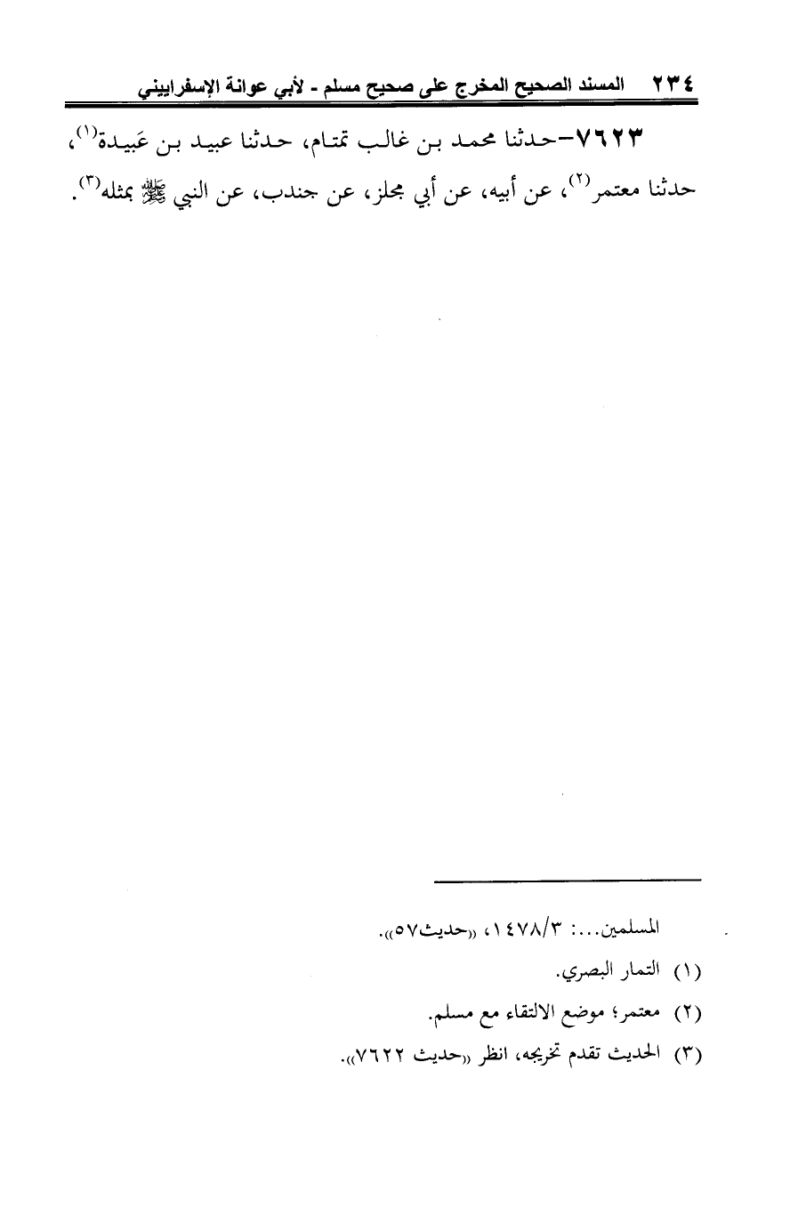 7623 - حدثنا محمد بن غالب تمتام، حدثنا عبيد بن عَبيدة (¬1) , حدثنا معتمر (¬2)، عن أبيه، عن أبي مجلز، عن جندب، عن النبي -صلى الله عليه وسلم- بمثله (¬3).