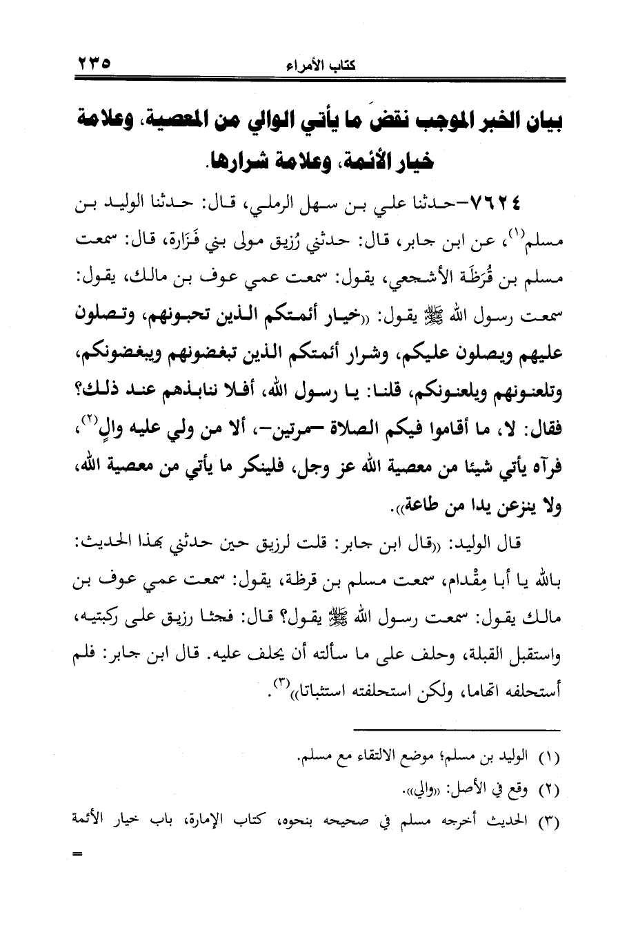 7624 - حدثنا علي بن سهل الرملي، قال: حدثنا الوليد بن مسلم (¬1)، عن ابن جابر، قال: حدثني رُزيق مولى بني فَزَارة، قال: سمعت مسلم بن قُرَظَة الأشجعي، يقول: سمعت عمي عوف بن مالك، يقول: سمعت رسول الله -صلى الله عليه وسلم- يقول: "خيار أئمتكم الذين تحبونهم، وتصلون عليهم ويصلون عليكم، وشرار أئمتكم الذين تبغضونهم ويبغضونكم، وتلعنونهم ويلعنونكم، قلنا: يا رسول الله، أفلا ننابذهم عند ذلك؟ فقال: لا، ما أقاموا فيكم الصلاة -مرتين-، ألا من ولي عليه والٍ (¬2)، فرآه يأتي شيئا من معصية الله عز وجل، فلينكر ما يأتي من معصية الله، ولا ينزعن يدا من طاعة".