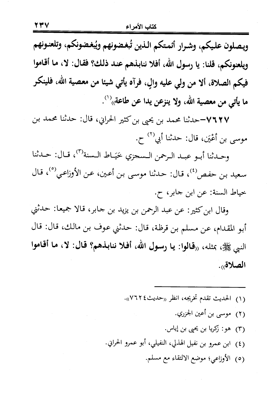 وقال ابن كثير: عن عبد الرحمن بن يزيد بن جابر، قالا جميعا: حدثني أبو المقدام، عن مسلم بن قرظة، قال: حدثني عوف بن مالك، قال: قال النبي -صلى الله عليه وسلم-، بمثله، "قالوا: يا رسول الله، أفلا ننابذهم؟ قال: لا، ما أقاموا الصلاة".
