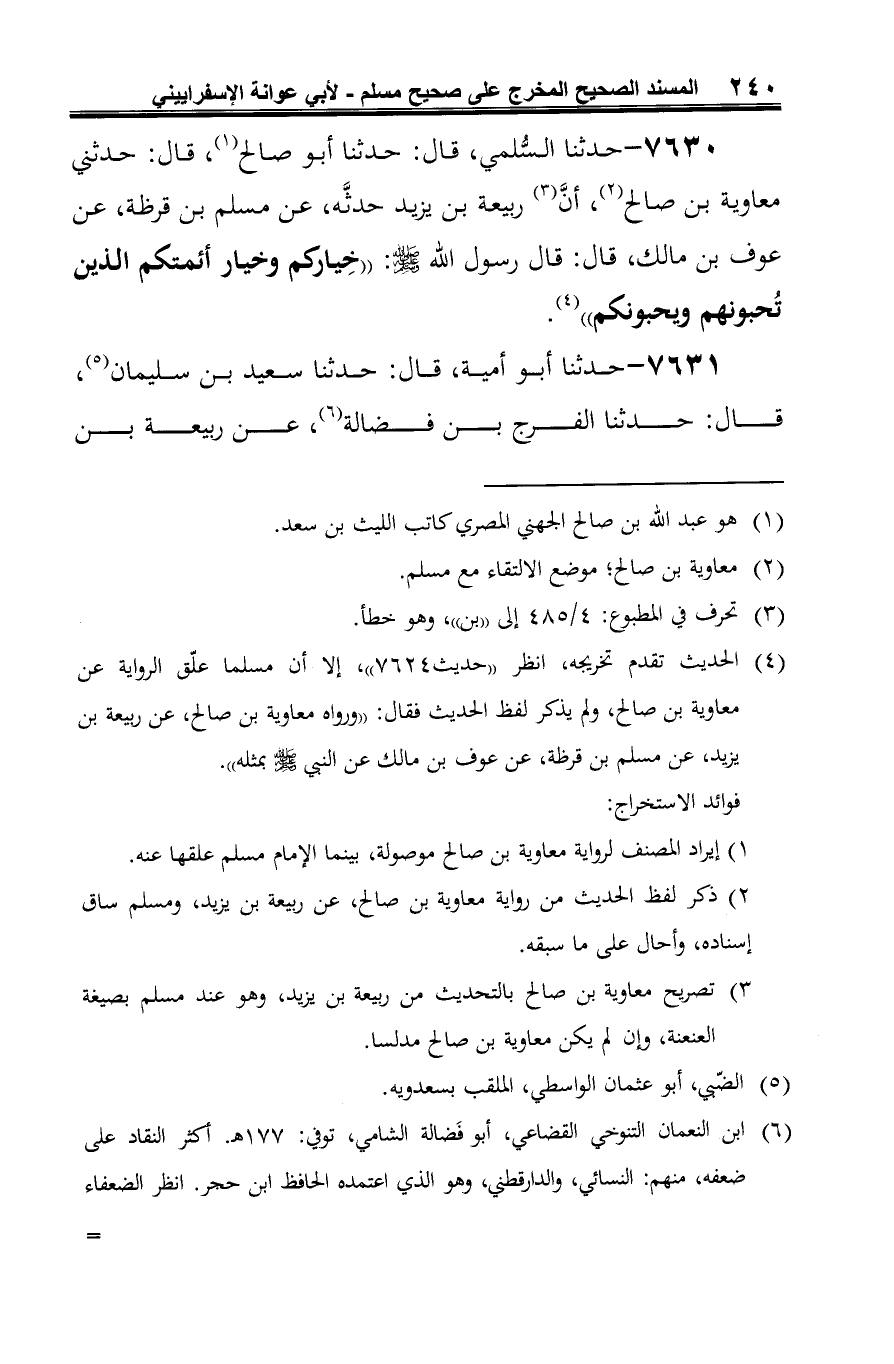 7630 - حدثنا السُّلمي، قال: حدثنا أبو صالح (¬1)، قال: حدثني معاوية بن صالح (¬2)، أنَّ (¬3) ربيعة بن يزيد حدثَّه، عن مسلم بن قرظة، عن عوف بن مالك، قال: قال رسول الله -صلى الله عليه وسلم-: "خِياكم وخيار أئمتكم الذين تُحبونهم ويحبونكم" (¬4).