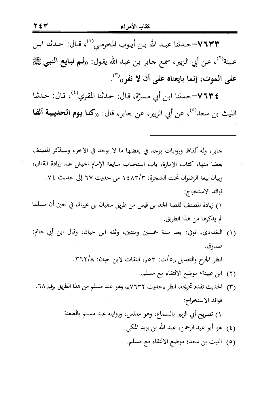 7633 - حدثنا عبد الله بن أيوب المخرمي (¬1)، قال: حدثنا ابن عيينة (¬2)، عن أبي الزبير، سمع جابر بن عبد الله يقول: " لم نبايع النبي -صلى الله عليه وسلم- على الموت، إنما بايعناه على أن لا نفر" (¬3).