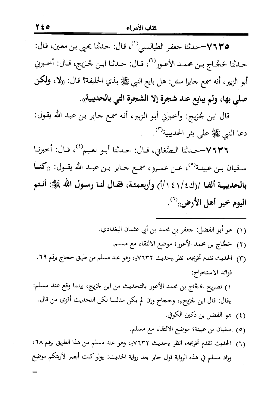 7635 - حدثنا جعفر الطيالسي (¬1)، قال: حدثنا يحيى بن معين، قال: حدثنا حَجَّاج بن محمد الأعور (¬2)، قال: حدثنا ابن جُرَيج، قال: أخبرني أبو الزبير، أنه سمع جابرا سئل: هل بايع النبي -صلى الله عليه وسلم- بذي الحليفة؟ قال: "لا، ولكن صلى بها، ولم يبايع عند شجرة إلا الشجرة التي بالحديبية".