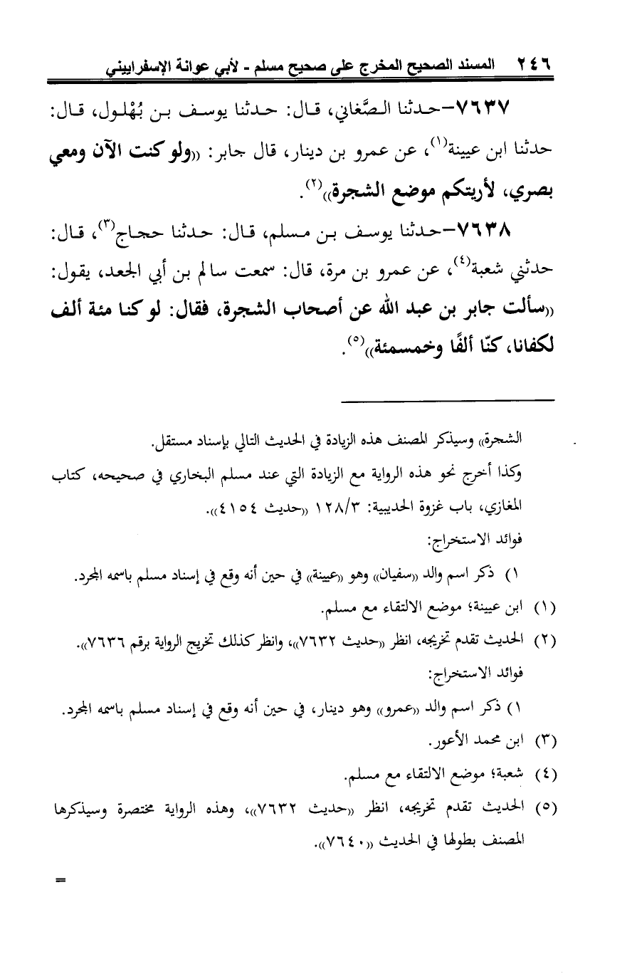 7638 - حدثنا يوسف بن مسلم، قال: حدثنا حجاج (¬1)، قال: حدثني شعبة (¬2)، عن عمرو بن مرة، قال: سمعت سالم بن أبي الجعد، يقول: "سألت جابر بن عبد الله عن أصحاب الشجرة، فقال: لو كنا مئة ألف لكفانا، كنّا ألفًا وخمسمئة" (¬3).