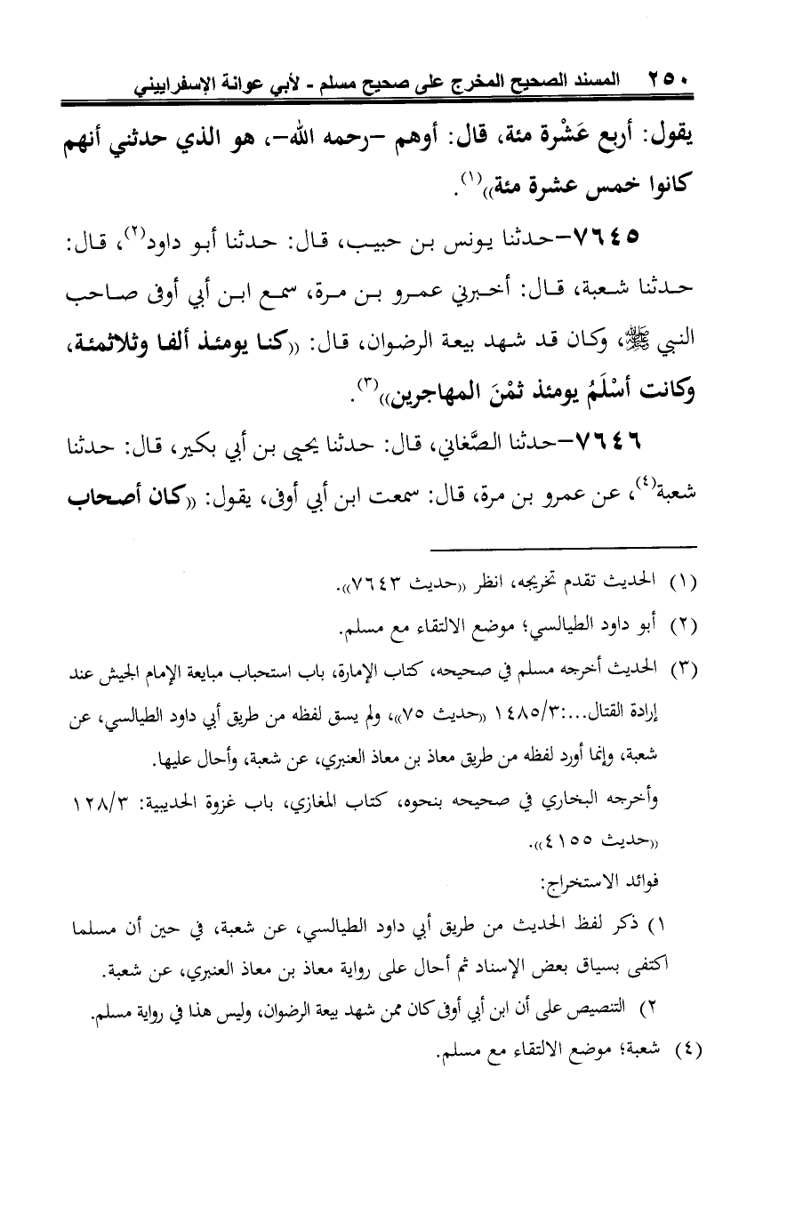 7645 - حدثنا يونس بن حبيب، قال: حدثنا أبو داود (¬1)، قال: حدثنا شعبة، قال: أخبرني عمرو بن مرة، سمع ابن أبي أوفى صاحب النبي -صلى الله عليه وسلم-، وكان قد شهد بيعة الرضوان، قال: "كا يومئذ ألفا وثلاثمئة، وكانت أسلَمُ يومئذ ثمْنَ المهاجرين" (¬2).