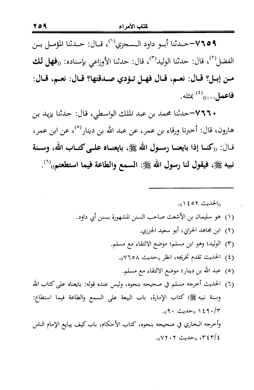 7659 - حدثنا أبو داود السجزي (¬1)، قال: حدثنا المؤمل بن الفضل (¬2)، قال: حدثنا الوليد (¬3)، قال: حدثنا الأوزاعي بإسناده: "فهل لك من إبل؟ قال: نعم، قال فهل تؤدي صدقتها؟ قال: نعم، قال: فاعمل ... " (¬4) بمثله.