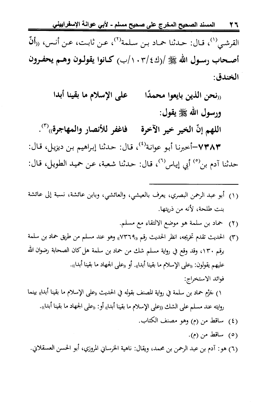 -[27]- سمعت أنس بن مالك (¬4)، يقول: "كانت الأنصار يوم الخندق تقول: نحن الذين بايعوا محمدا ... " ثم ذكر مثله // (¬5) (¬6).