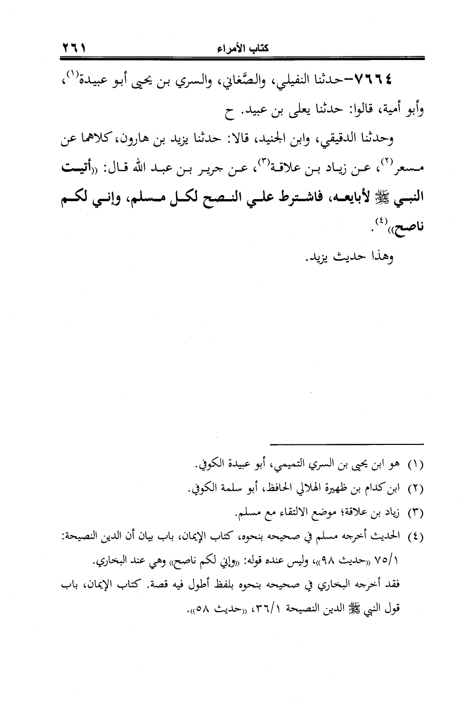 وحدثنا الدقيقي، وابن الجنيد، قالا: حدثنا يزيد بن هارون، كلاهما عن مسعر (¬2)، عن زياد بن علاقة (¬3)، عن جرير بن عبد الله قال: "أتيت النبي -صلى الله عليه وسلم- لأبايعه، فاشترط علي النصح لكل مسلم، وإني لكم ناصح" (¬4).
