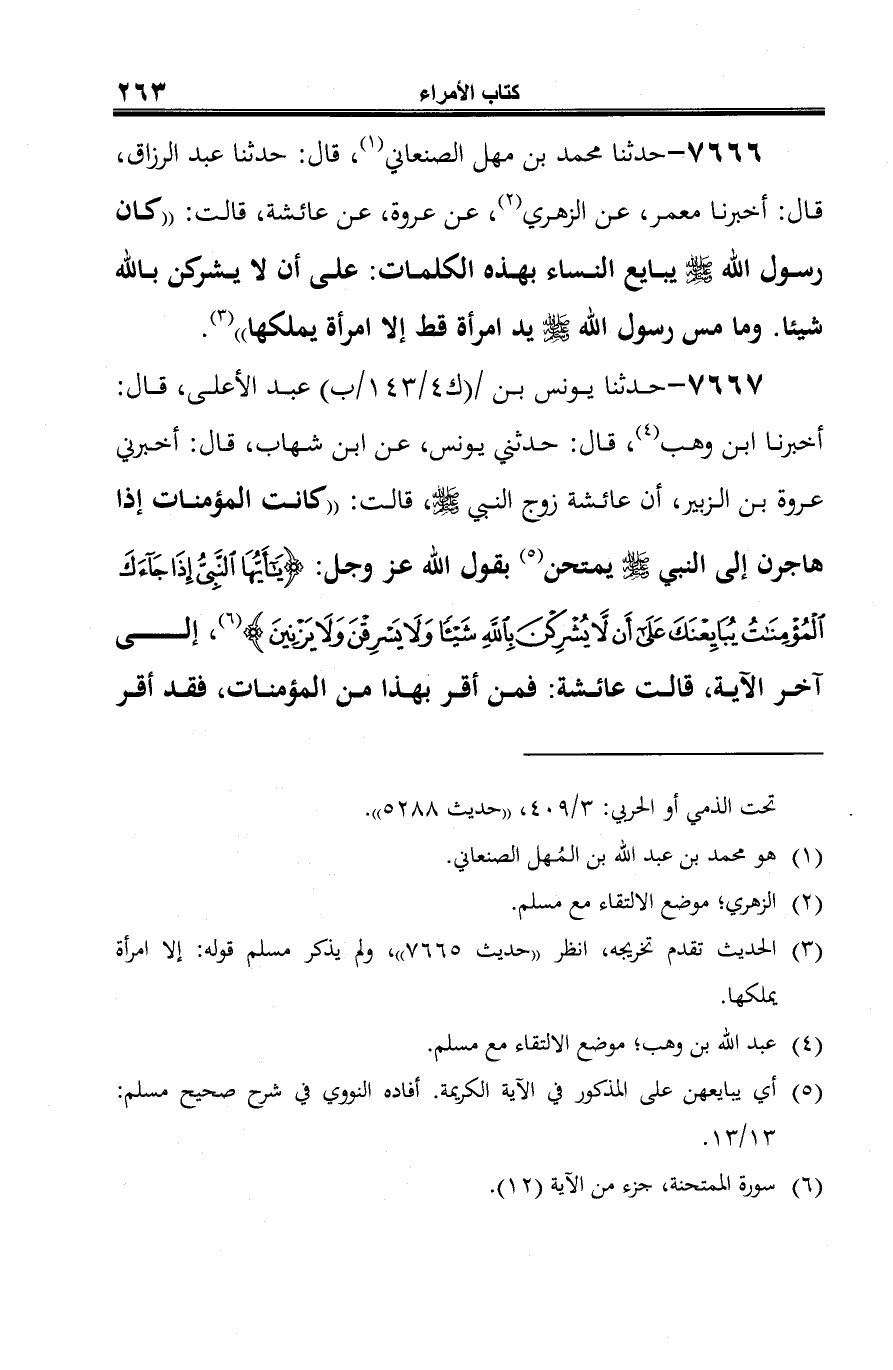 7666 - حدثنا محمد بن مهل الصنعاني (¬1)، قال: حدثنا عبد الرزاق، قال: أخبرنا معمر، عن الزهري (¬2)، عن عروة، عن عائشة، قالت: "كان رسول الله -صلى الله عليه وسلم- يبايع النساء بهذه الكلمات: على أن لا يشركن بالله شيئا. وما مس رسول الله -صلى الله عليه وسلم- يد امرأة قط إلا امرأة يملكها" (¬3).
