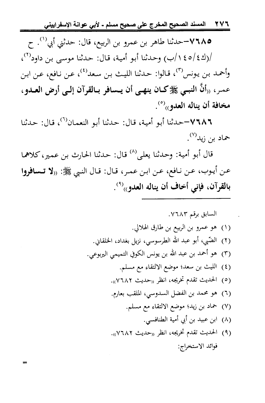 وحدثنا أبو أمية، قال: حدثنا موسى بن داود (¬2)، وأحمد بن يونس (¬3)، قالوا: حدثنا الليث بن سعد (¬4)، عن نافع، عن ابن عمر، "أنَّ النبي -صلى الله عليه وسلم- كان ينهى أن يسافر بالقرآن إلى أرض العدو، مخافة أن يناله العدو" (¬5).