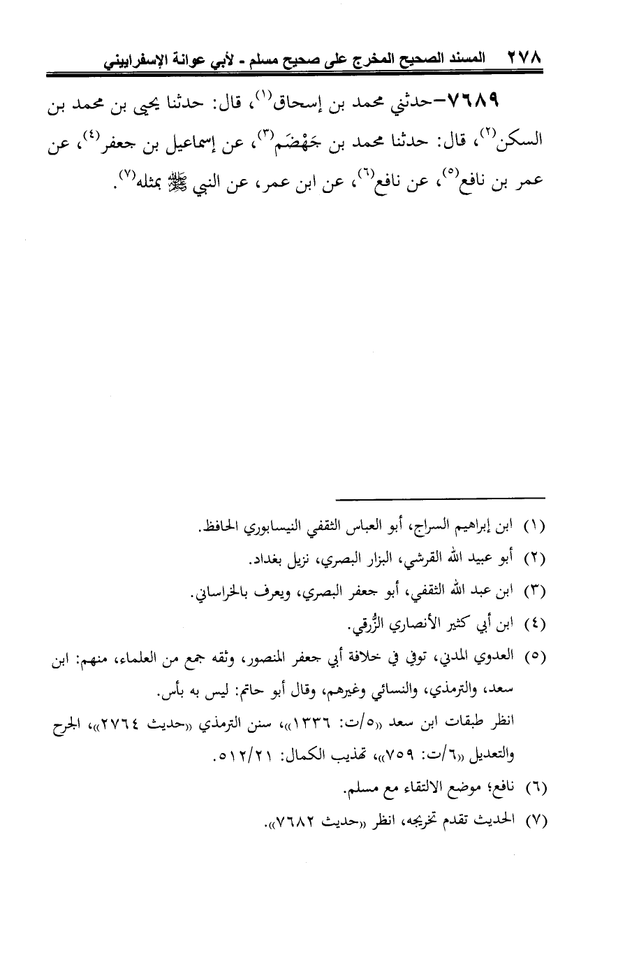 7689 - حدثني محمد بن إسحاق (¬1)، قال: حدثنا يحيى بن محمد بن السكن (¬2)، قال: حدثنا محمد بن جَهْضَم (¬3)، عن إسماعيل بن جعفر (¬4)، عن عمر بن نافع (¬5)، عن نافع (¬6)، عن ابن عمر، عن النبي -صلى الله عليه وسلم- بمثله (¬7).