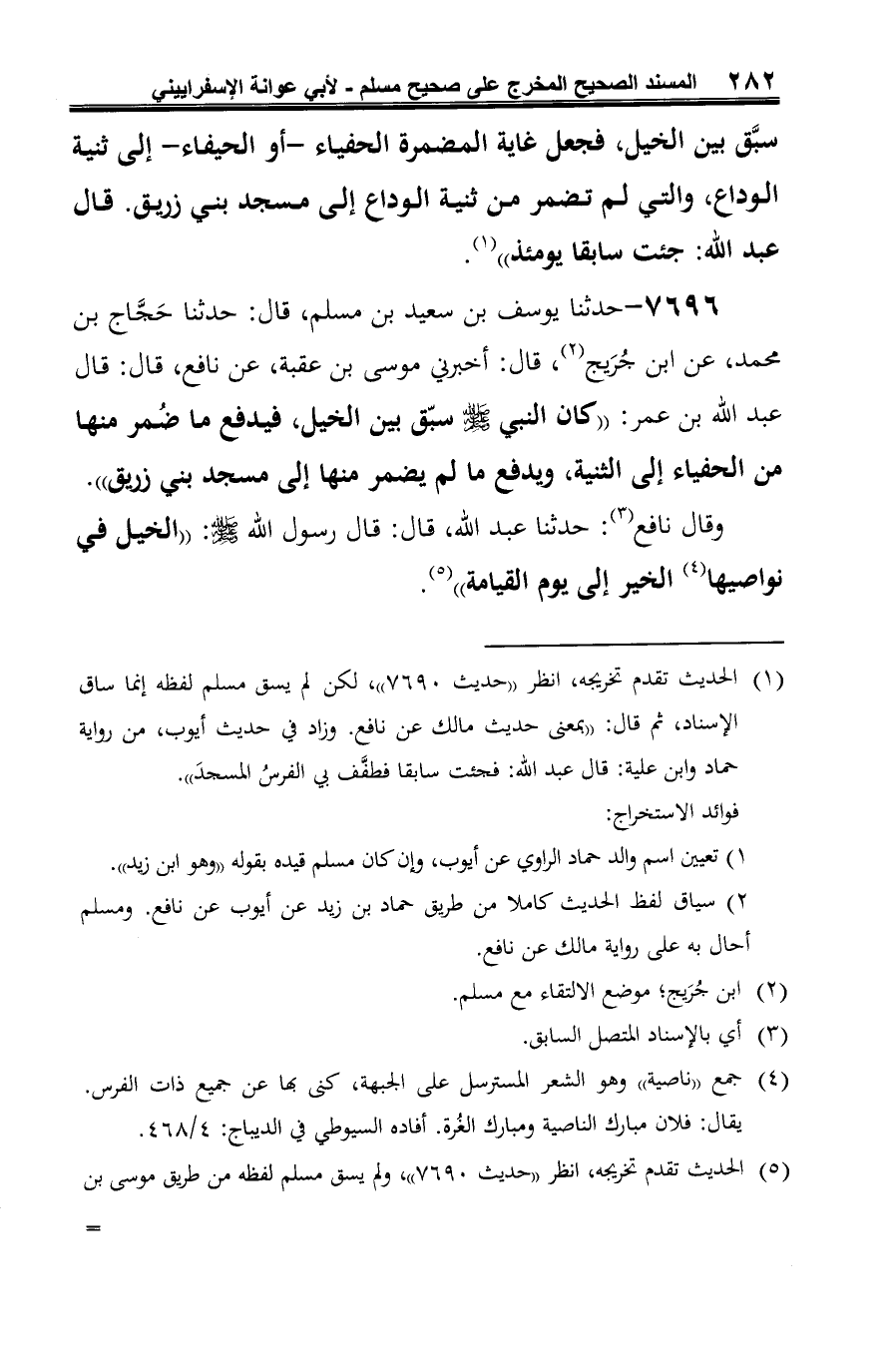 7696 - حدثنا يوسف بن سعيد بن مسلم، قال: حدثنا حَجَّاج بن محمد، عن ابن جُرَيج (¬1)، قال: أخبرني موسى بن عقبة، عن نافع، قال: قال عبد الله بن عمر: "كان النبي -صلى الله عليه وسلم- سبّق بين الخيل، فيدفع ما ضُمر منها من الحفياء إلى الثنية، ويدفع ما لم يضمر منها إلى مسجد بني زريق".